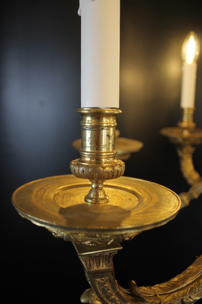 Retrouver le mobilier ou les objets d''art similaires à « Lustre Mazarin en bronze doré, circa 1820 » présenté par Antiquités Thierry Martin, antiquaire à St-Urbain dans la catégorie Lustre Restauration - Charles X, Luminaires.