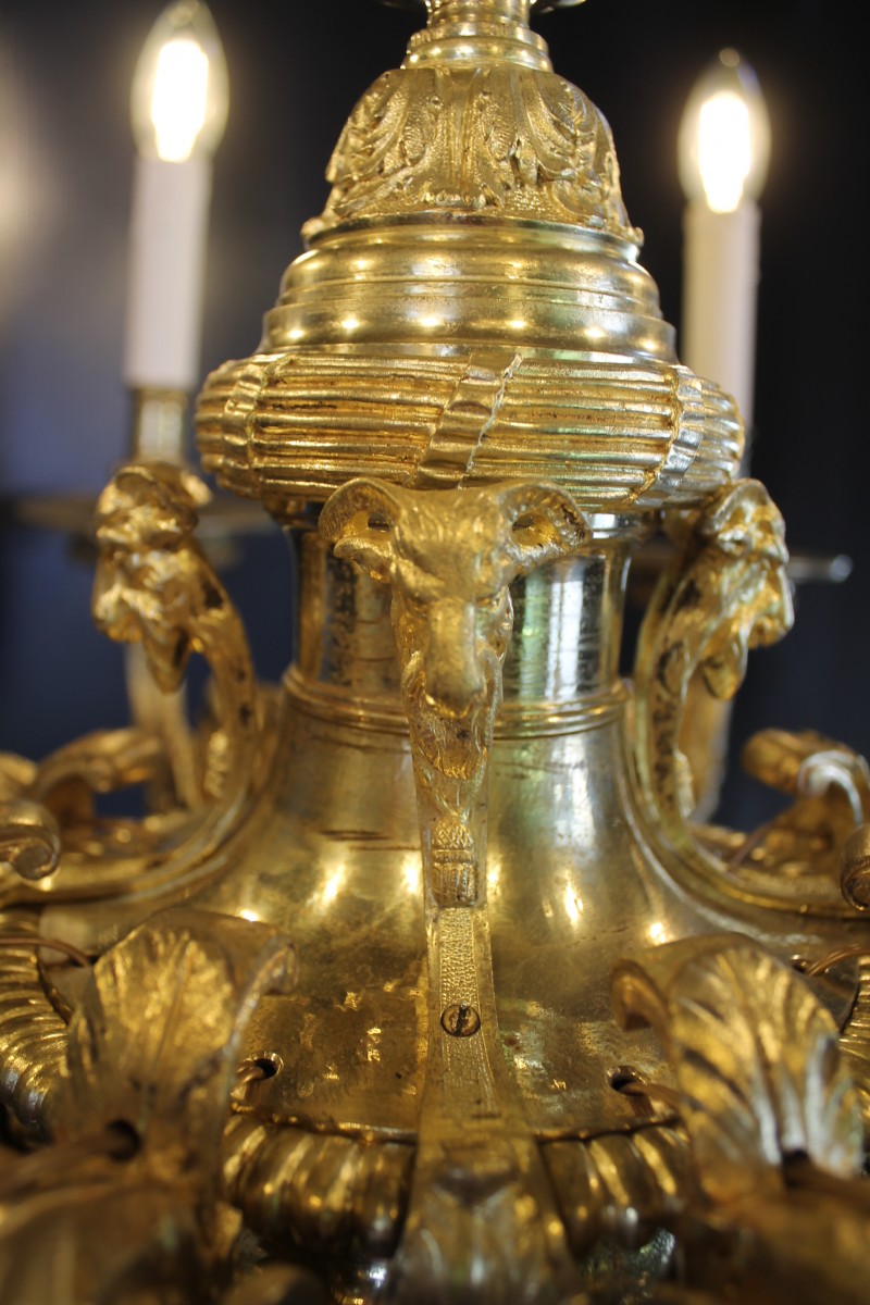 Le fût central à décors de têtes de béliers en applique et simulant un vase Médicis à quatre anses sommées de têtes de femmes.