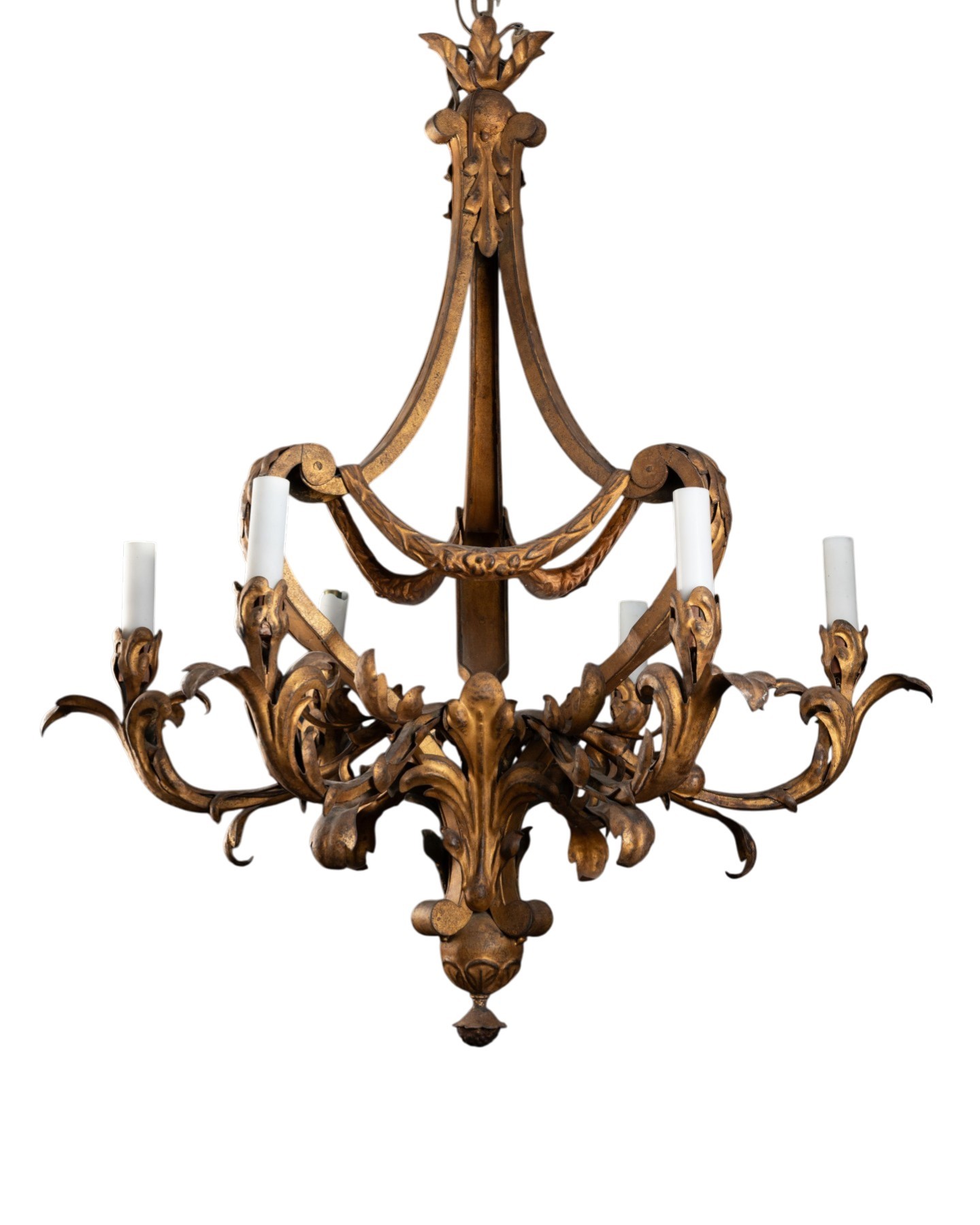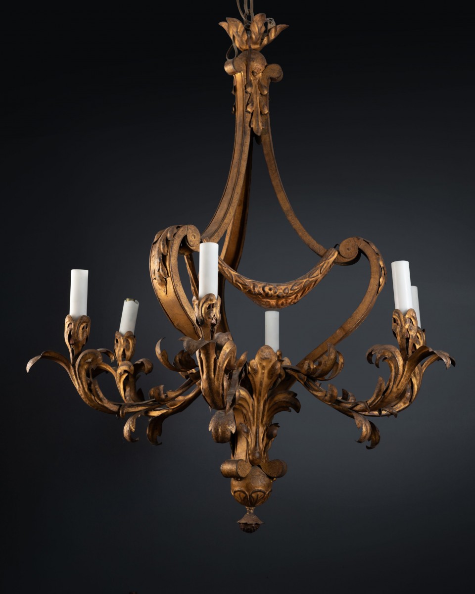 Lustre en ferro battuto dorato à six bras de lumière, dont la forme et les imposantes volutes empruntent aux inventions de Jean Bérain et aux lustres de Charles-André Boulle, tout en les mêlant de motifs naturalistes — feuillages et guirlandes, grappes et fleurs de lys stylisées, typiques de la période suivante et qui annoncent les lustres rocaille de Philippe et Jacques Caffiéri.