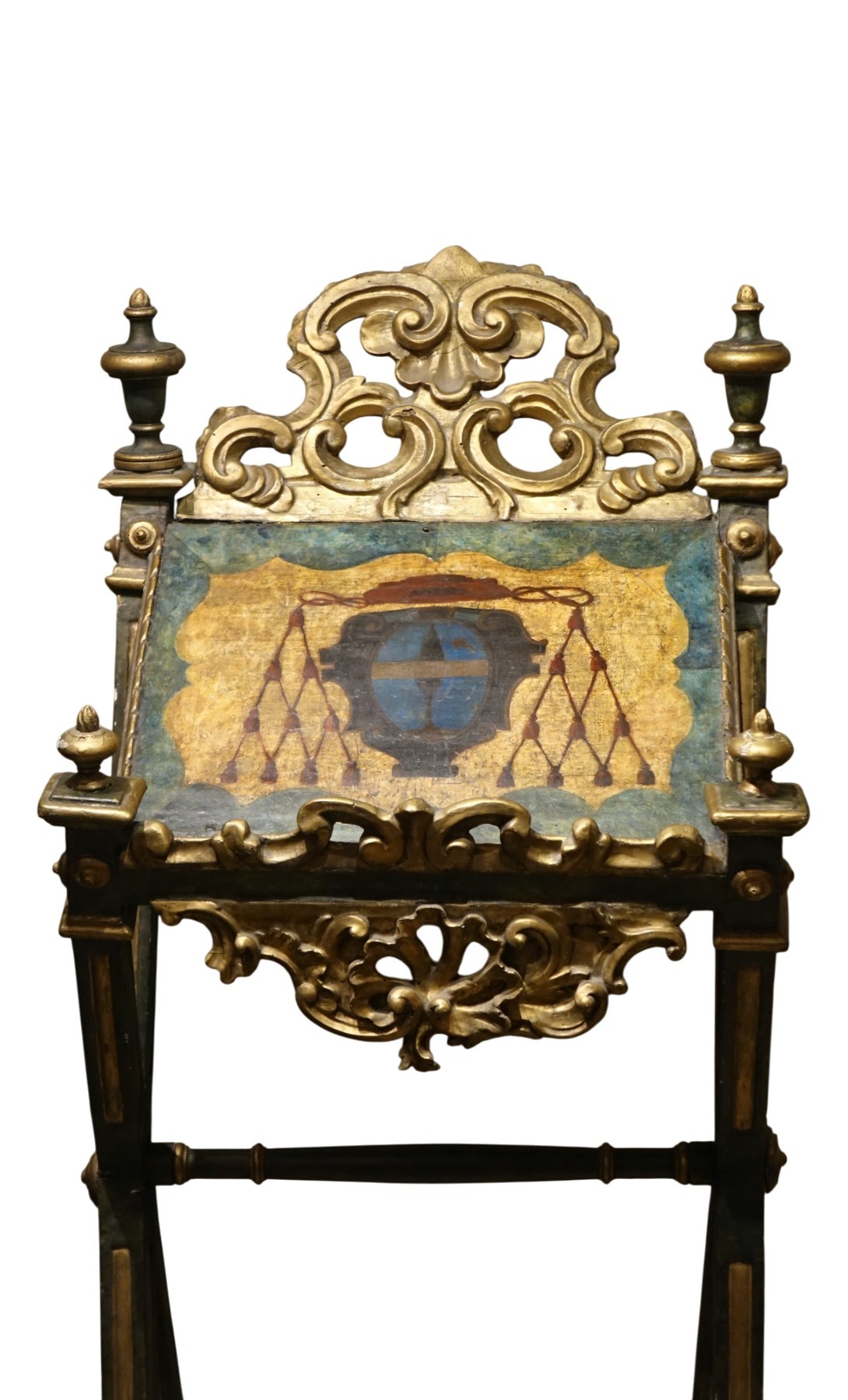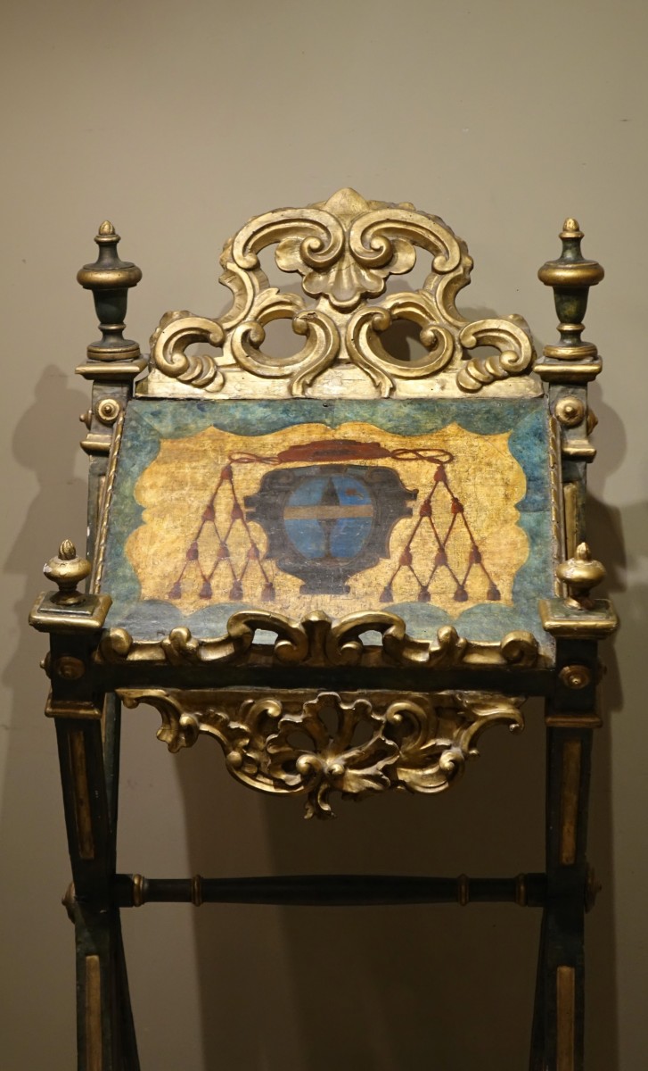 Lutrin de lecture de grande dimension , en bois sculpté et peint à décor d'un blason cardinalice . Venise, 18e s. Rare, très bel effet . Usures dûes à l'usage l'attribution du blason reste à définir.