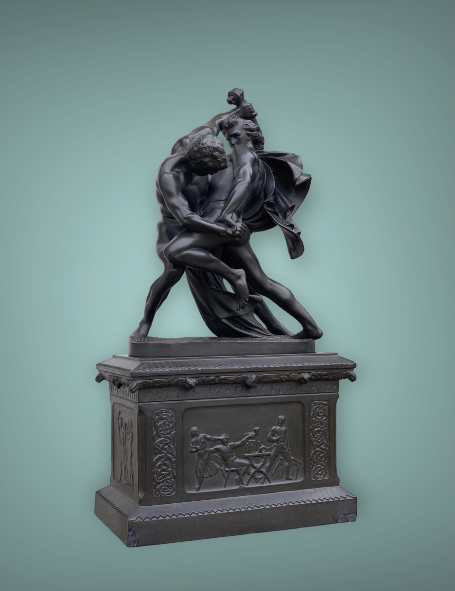 « Bältesspännare »- Les lutteurs ceinturés- illustre, en bas-reliefs sur les 4 faces de la base, les épisodes et l'issue fatale de la tragique rivalité amoureuse qui conduit au drame.