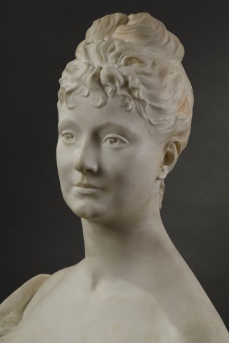 Le 'Buste de Mademoiselle Reichenberg' mesure 86 cm de hauteur et 23 cm de largeur. Il est magistralement sculpté dans du marbre blanc de Carrare fin, portant la signature 'J. Franceschi', témoignage du savoir-faire et de la compétence de l'artiste.