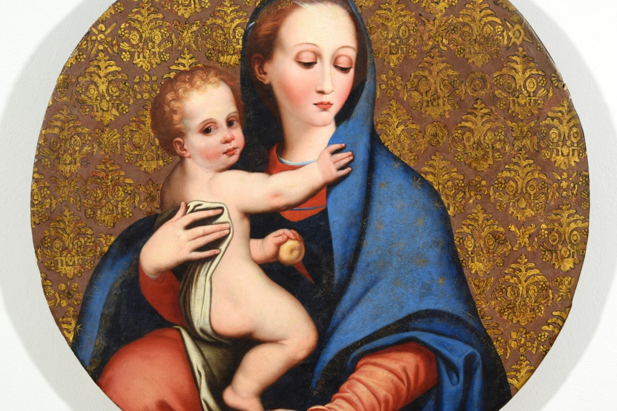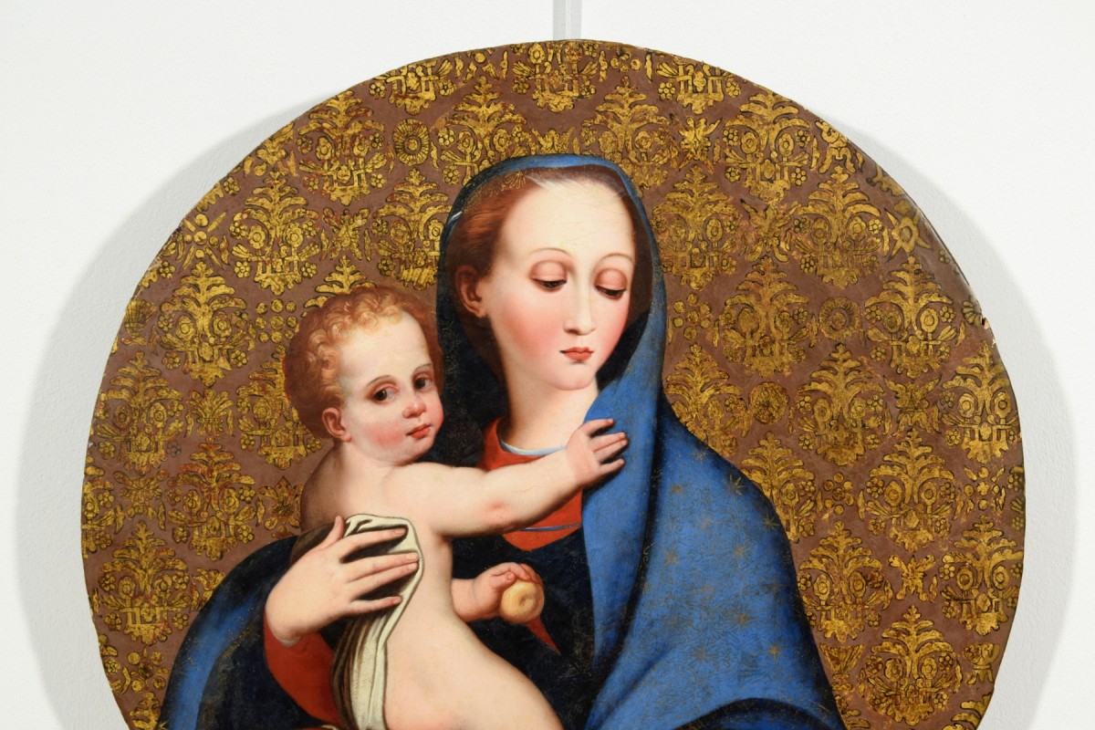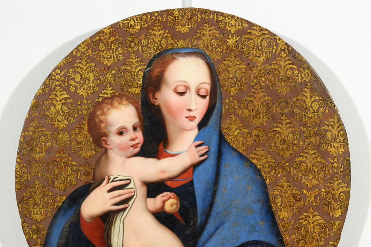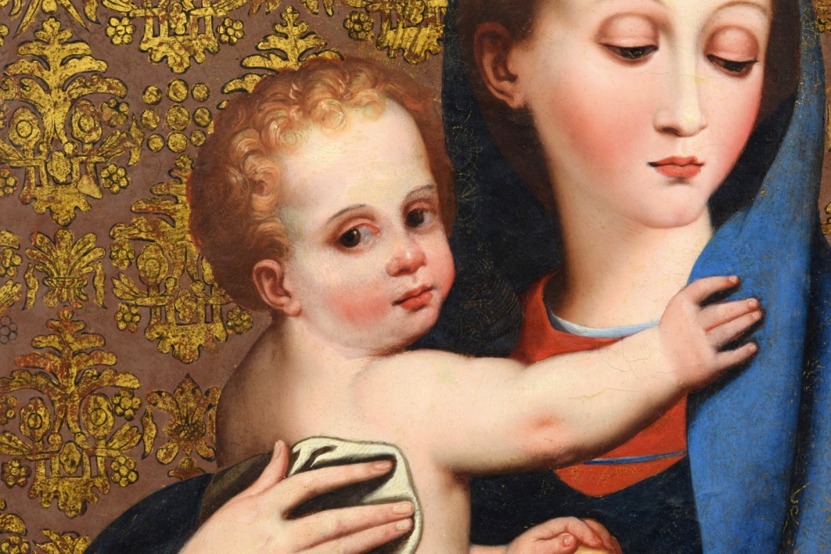 Ce tableau, réalisé en Italie centrale au XVIIe siècle, est une belle interprétation de la Madonna della Purità de Luis de Morales, représentée avec une grande précision dans le rendu des détails et des carnations. Le fond brun orné d’un motif doré de lys imite les tissus damassés en soie et or.