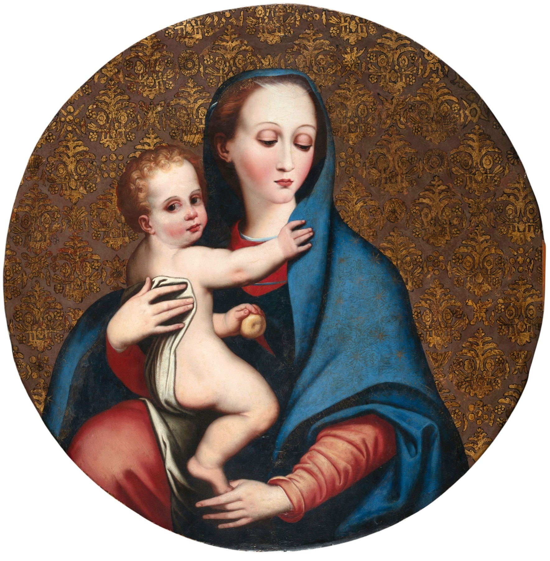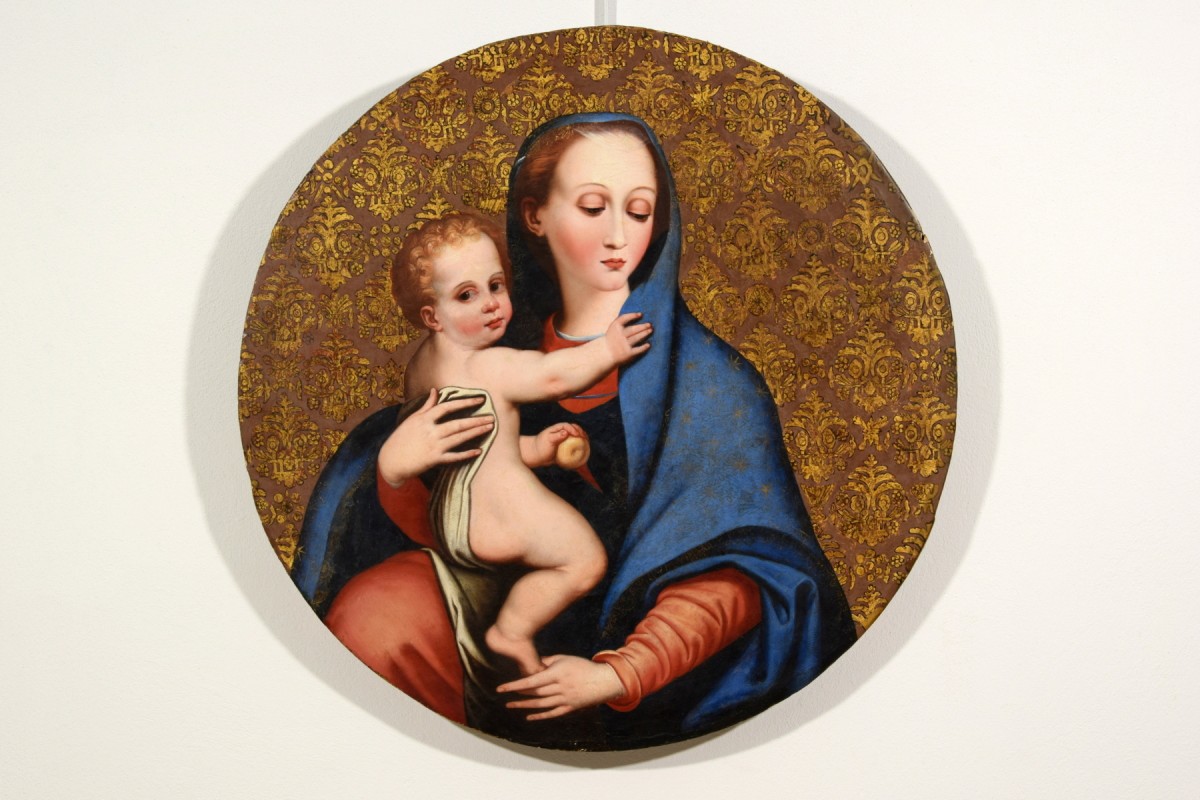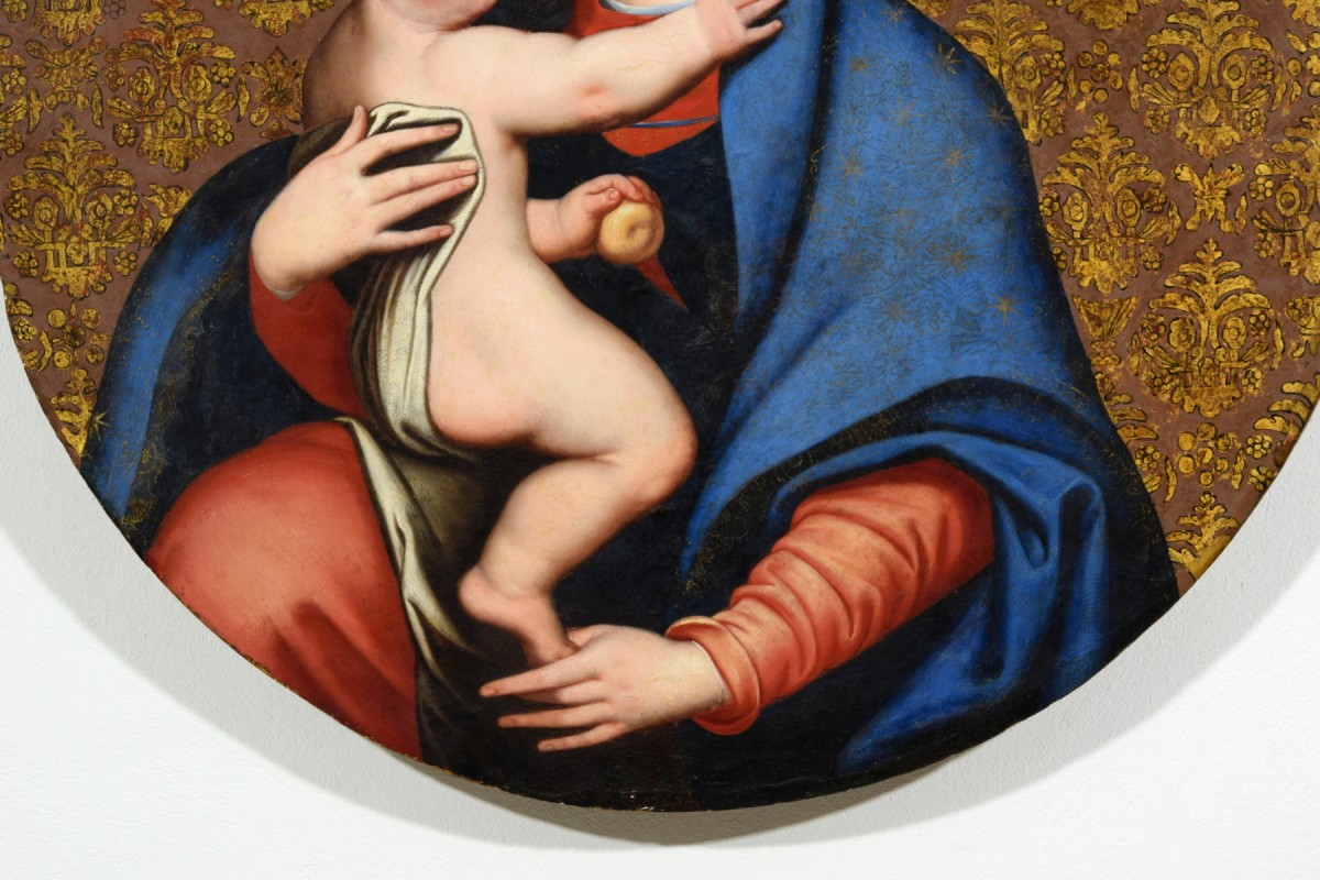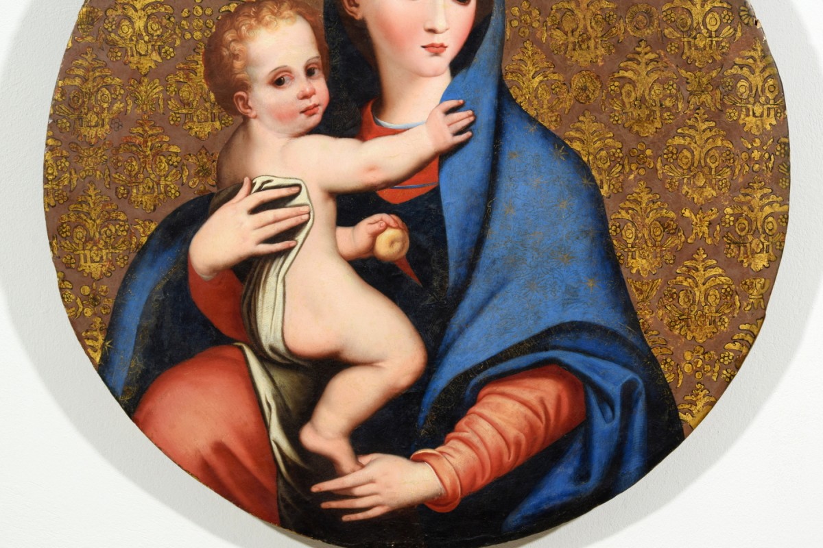 Ce tableau, réalisé en Italie centrale au XVIIe siècle, est une belle interprétation de la Madonna della Purità de Luis de Morales, représentée avec une grande précision dans le rendu des détails et des carnations. Le fond brun orné d’un motif doré de lys imite les tissus damassés en soie et or.