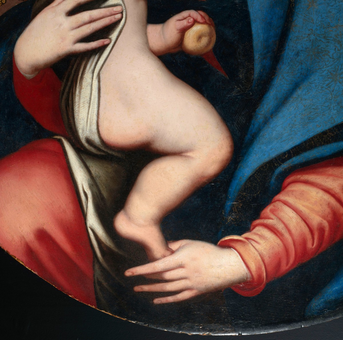 Vêtue d’un manteau bleu outremer qui enveloppe sa tête et ses épaules, et d’une robe rouge cinabre, elle garde les yeux mi-clos en signe de détachement humble et d’obéissance à la volonté divine. Elle soutient l’Enfant Jésus de son bras droit et, tout en le maintenant, caresse délicatement son petit pied droit avec une tendresse maternelle. L’Enfant est représenté dans un mouvement délicat, apparaissant en équilibre précaire. Assis sur le genou droit de la Vierge, il tourne la tête vers l’extérieur, avec un regard sérieux et communicatif plutôt que souriant. De sa main droite, il saisit un pan du manteau maternel, comme s’il voulait le rabattre pudiquement sur son visage. Dans sa main gauche, une pomme à peine visible symbolise Adam et Ève, référence au péché originel, devenu fruit salvateur de la rédemption.