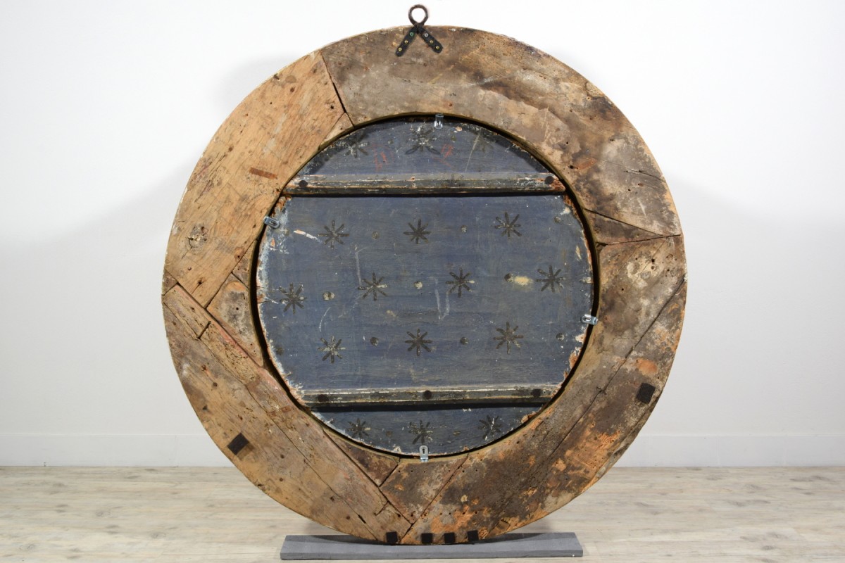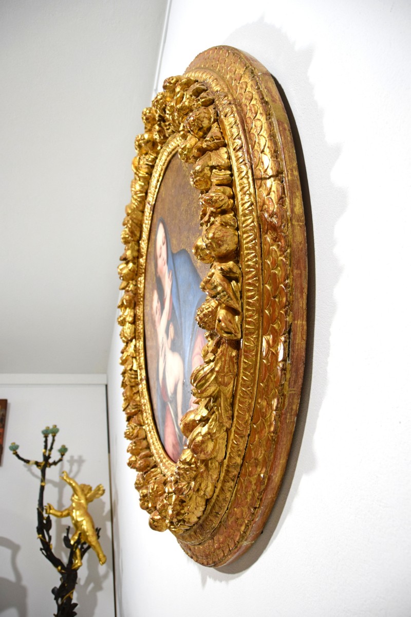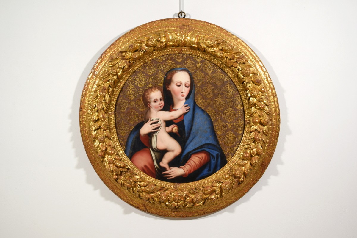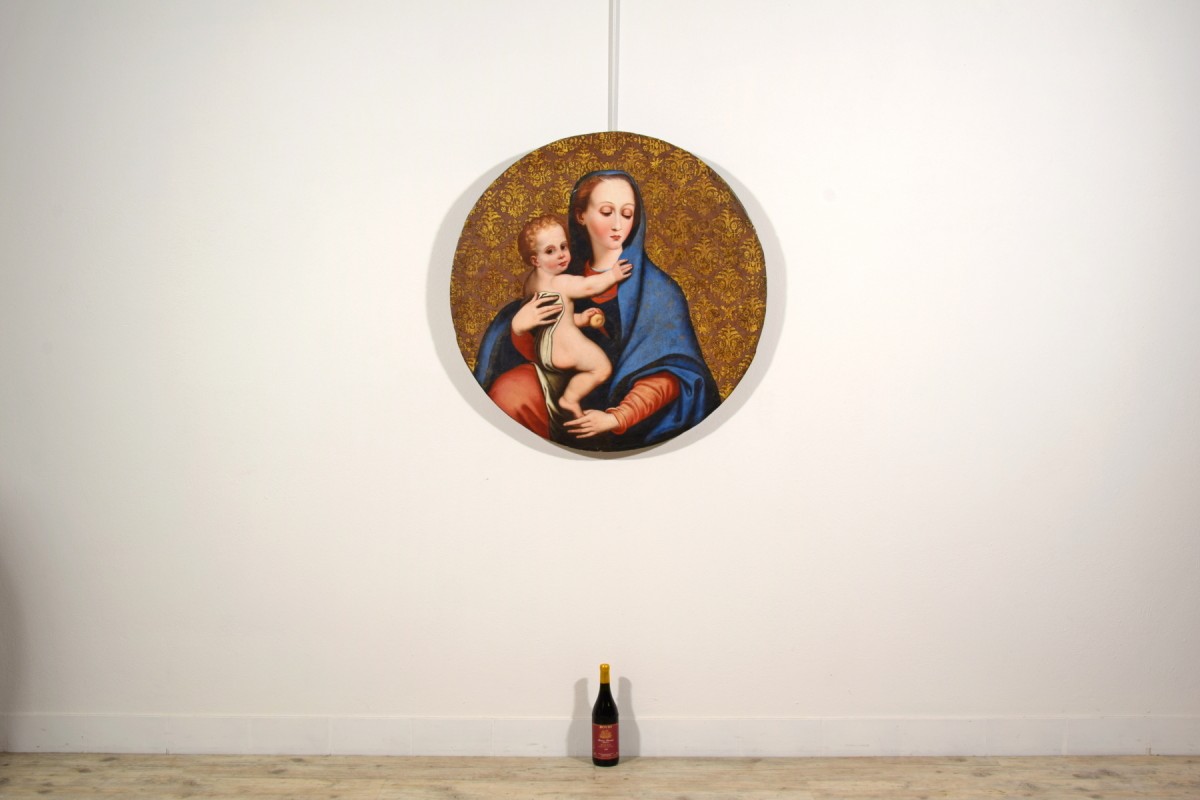Le tableau, réalisé à l’huile sur une table circulaire et présenté dans un imposant cadre en bois sculpté et doré, représente la Madonna della Purità, une iconographie de la Vierge Marie particulièrement répandue en Italie, notamment dans le Royaume de Naples, où cette dévotion s’est inscrite dans une importante tradition picturale.
