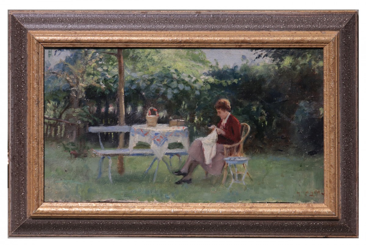 Magni Giuseppe (1869 - 1956) - Brodeuse Magni Giuseppe (Pistoia, 1869 - Florence, 1956) Peinture à l'huile sur panneau signée en bas à droite cadre 51x33cm 40x24cm panneau Il fréquenta l'Académie de Florence, où il suivit les enseignements de G. Fattori. Il se consacra à des paysages réalistes, des portraits et des scènes de genre qui lui valurent un large succès auprès du public national et international.