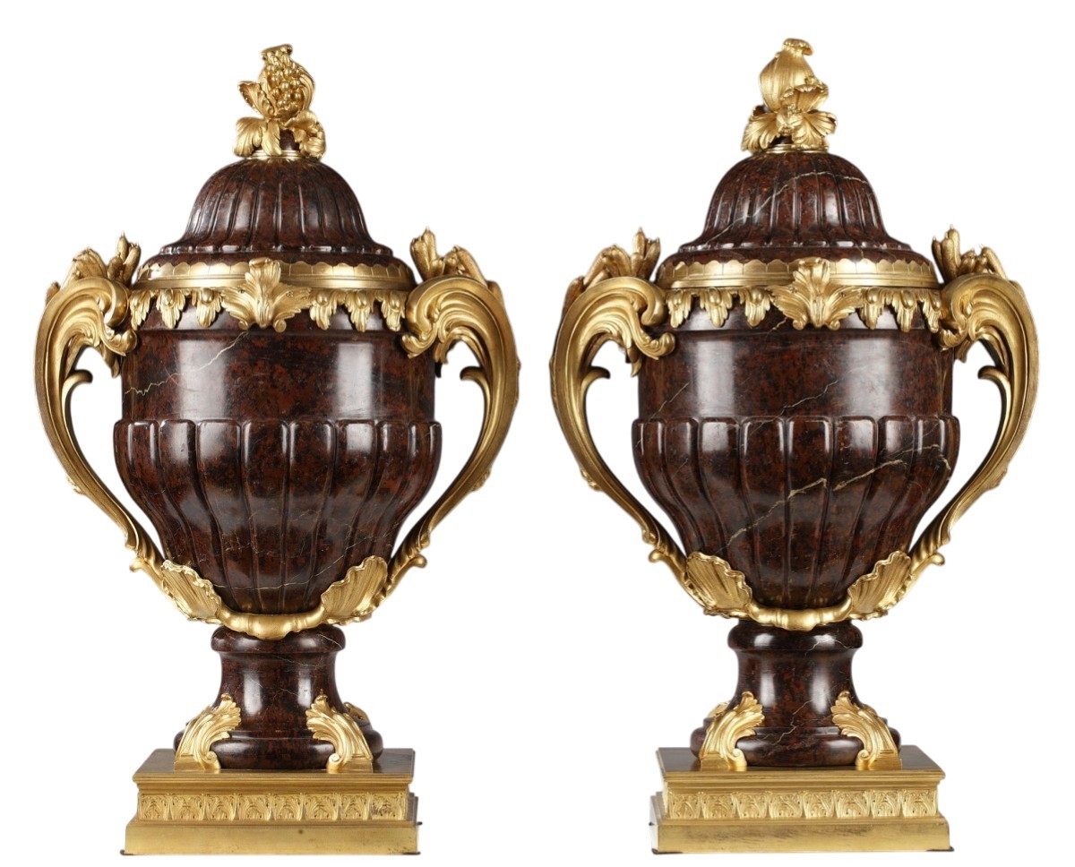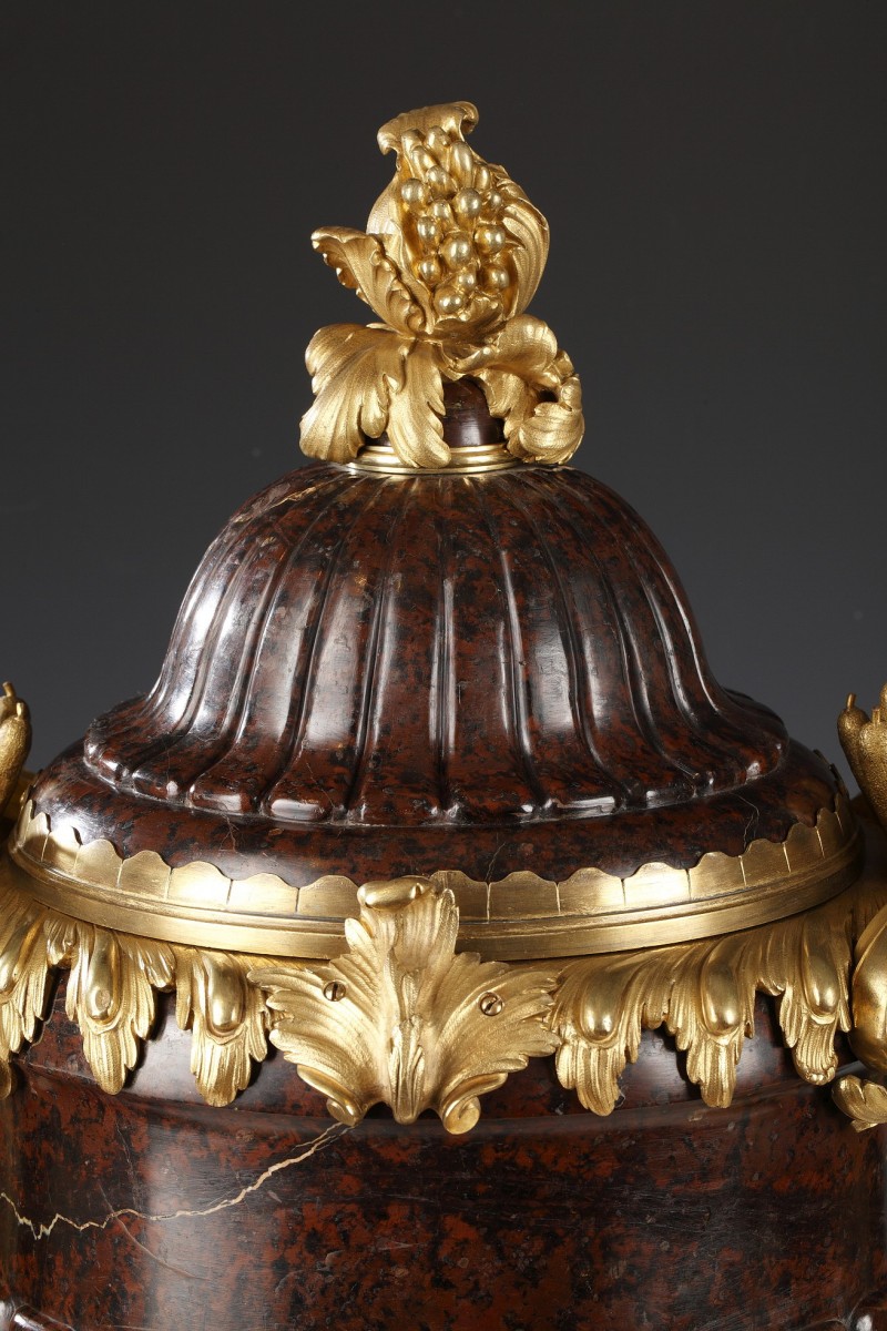 Importante paire de vases couverts de forme galbée à godrons saillants attr. à Maison Lexcellent, en granit d’Assouan et bronze ciselé et doré d’inspiration Louis XV dans le goût rocaille. Le couvercle est sommé d’une prise en forme de grenade éclatée accompagnée de feuillages, le corps flanqué de larges anses à enroulements d’où émergent des roseaux et qui se rattachent à l’encolure bordée de feuilles et de palmettes, le pied maintenu par quatre agrafes feuillagées et l’ensemble reposant sur une base carrée à décor de feuillages.