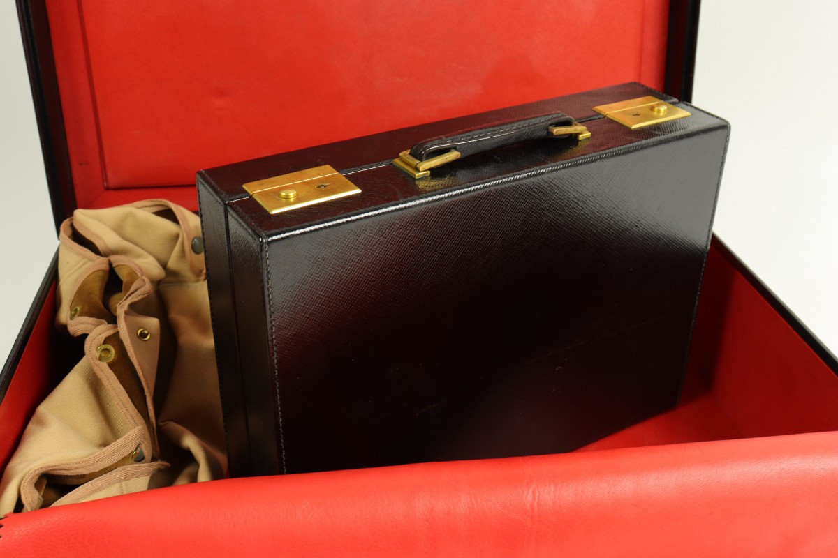 Mallette de voyage en cuir maroquin noir doublé de maroquin rouge, la trousse se détache et forme plateau. La garniture est en laque noire. Un exemplaire de cette mallette de voyage fut offerte par le président français Vincent Auriol à la Princesse Elisabeth à l'occasion de son mariage avec le Prince Philip en 1947.