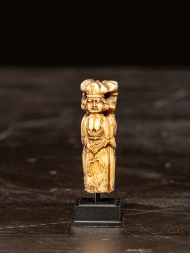Manche de couteau allemand en ivoire sculpté, orné d’un décor représentant trois personnages à la symbolique marquée dans le sud de l’Allemagne.