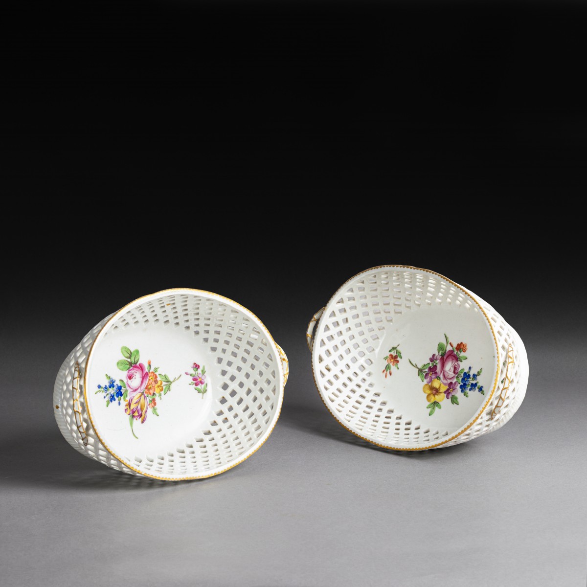 Paire de corbeilles ajourées, imitant la vannerie, en porcelaine de la manufacture du Comte d'Artois (CP sous couronne, pour Charles-Philippe). Chacune à deux anses de préhension. Les fonds à décor peint de bouquets polychromes.
