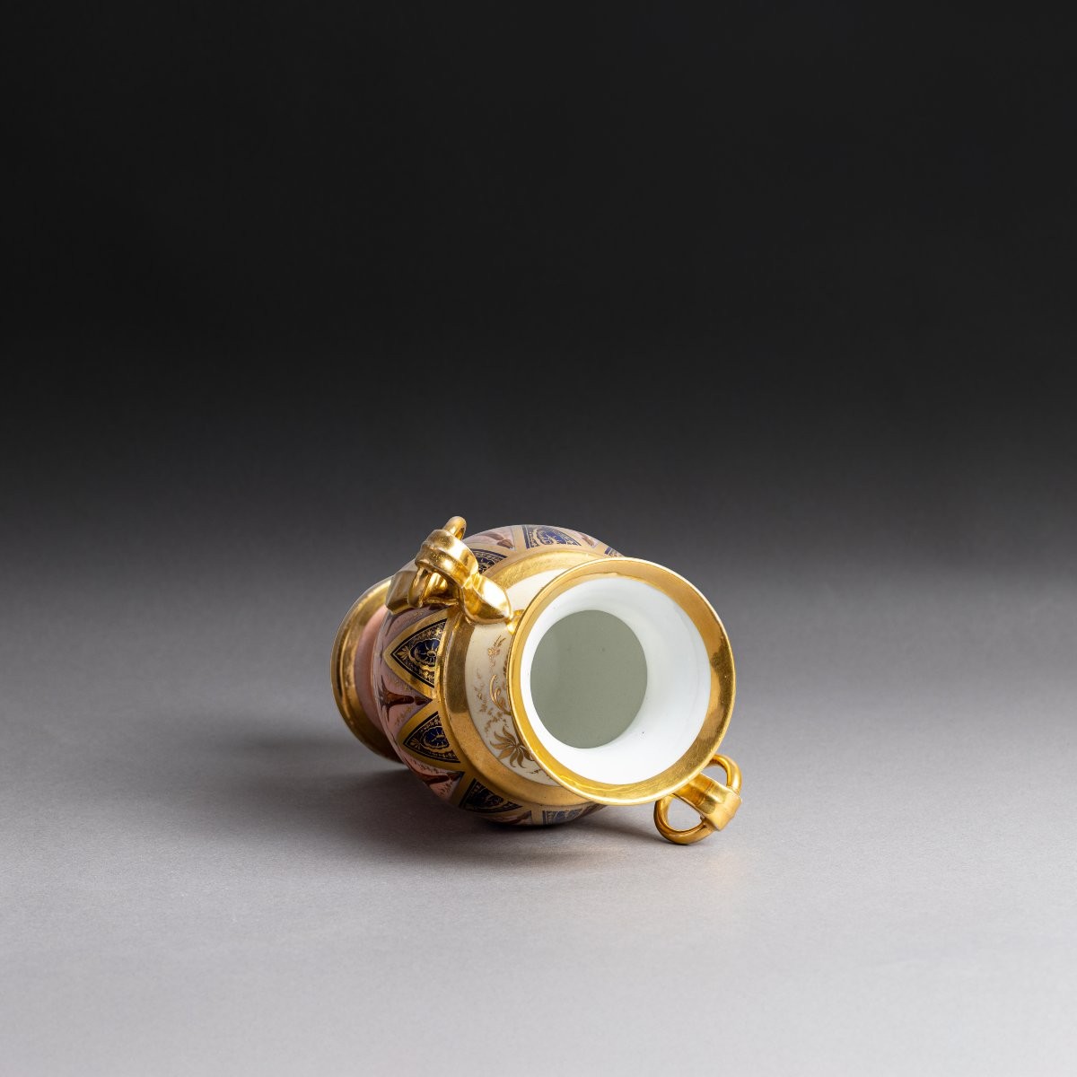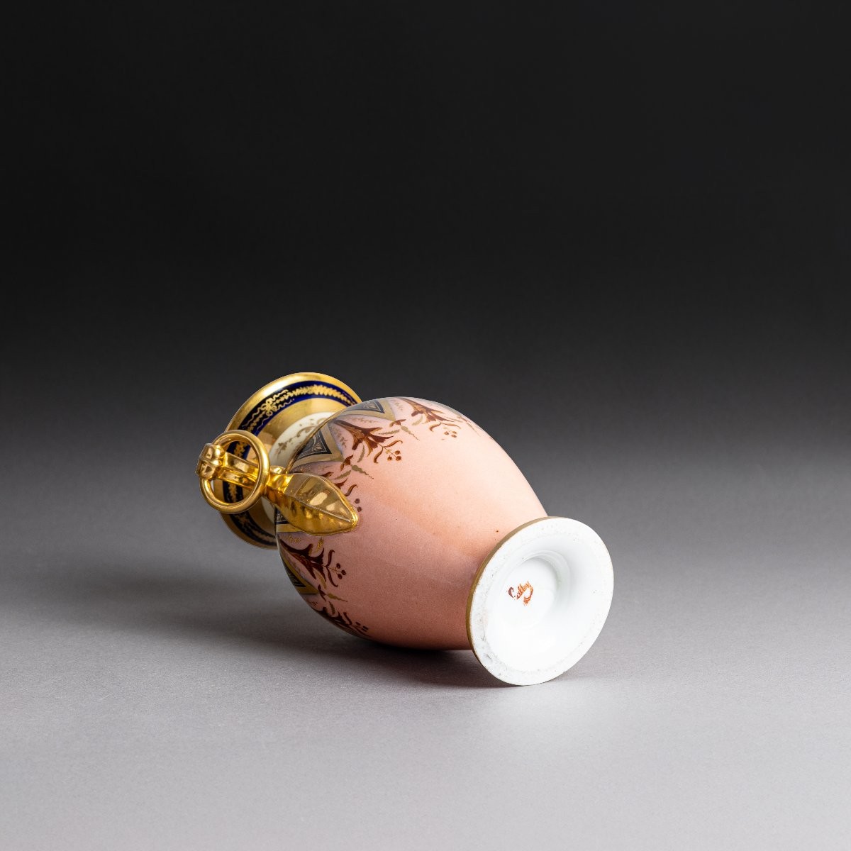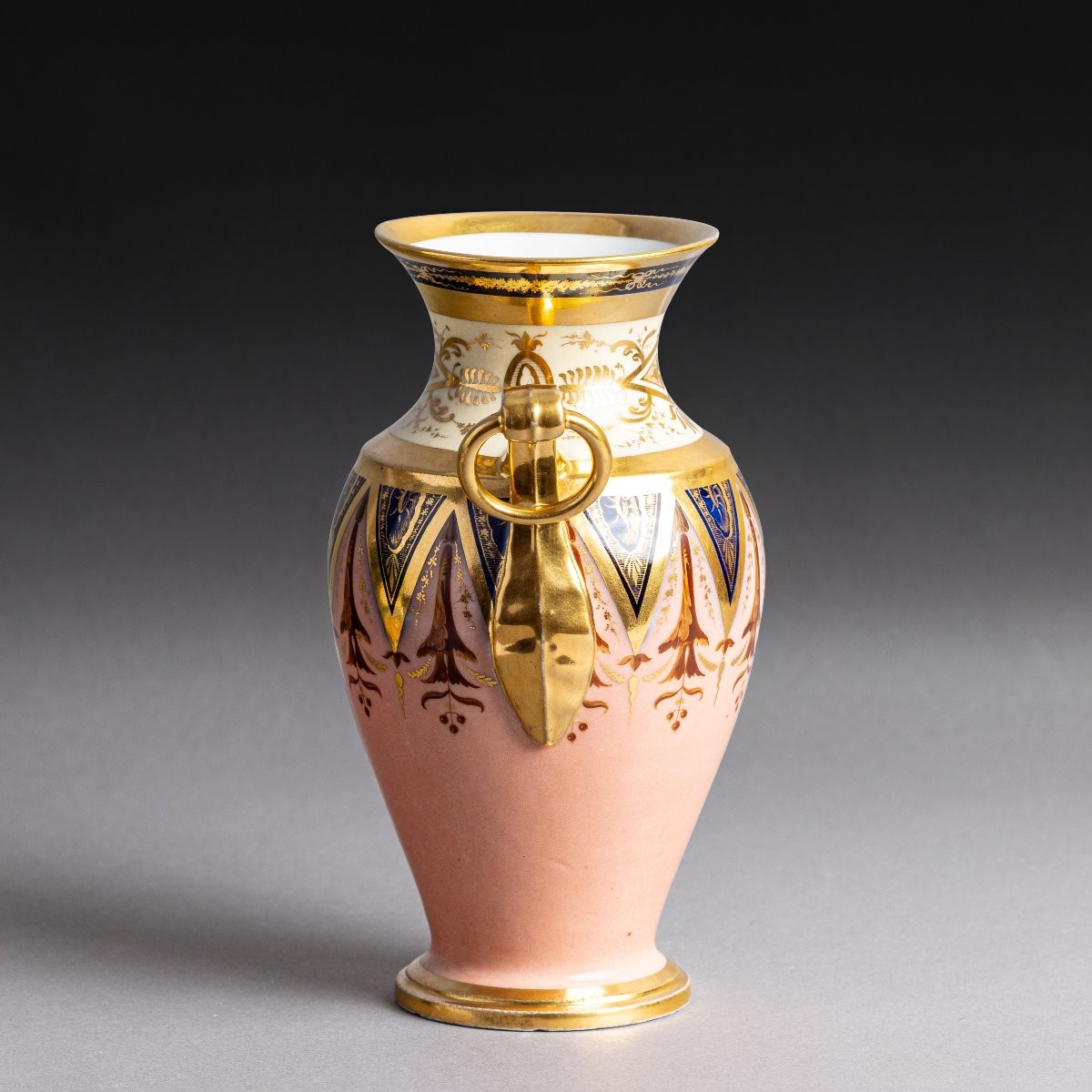 Rare vase de forme balustre, à deux anses à anneaux repercés. La panse à fond rose-orange pâle, et chevrons en bleu de four. La partie supérieure de nuance ivoire. Raffiné décor de guirlandes en dorure, lambrequins sépias, motifs rayonnants, palmettes... Le blanc de ce modèle particulier est probablement issu des fours de la manufacture de Locré.