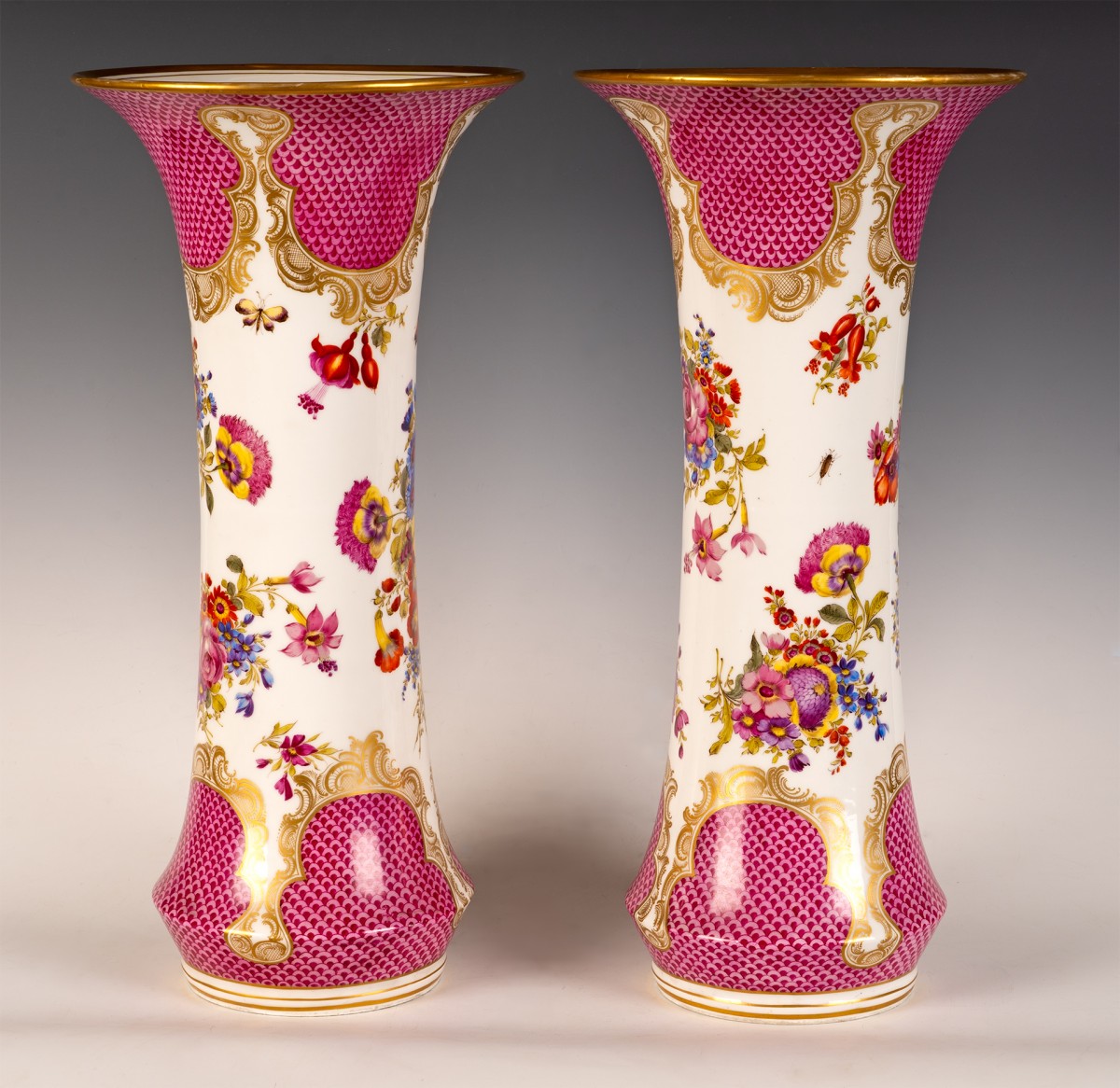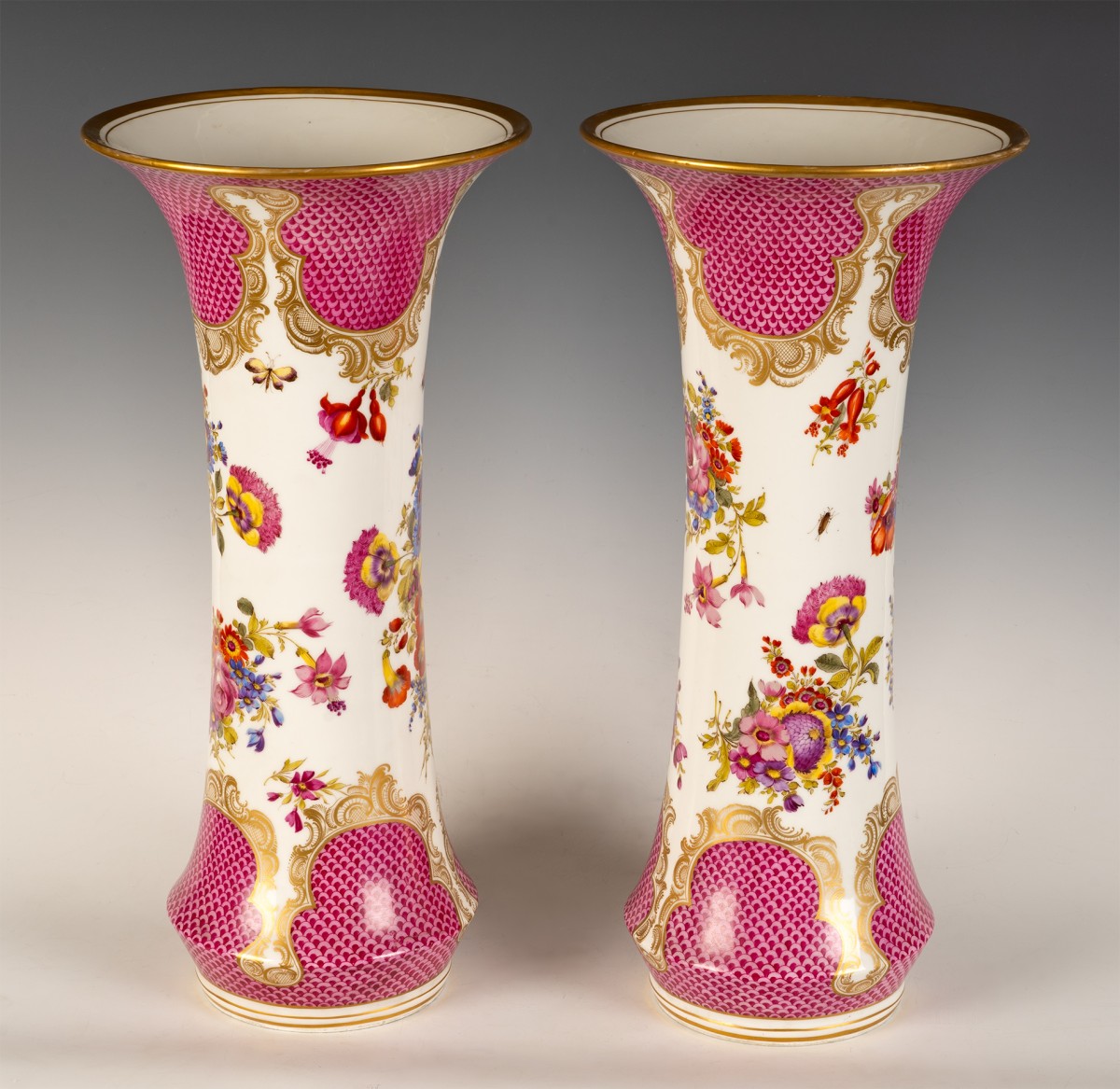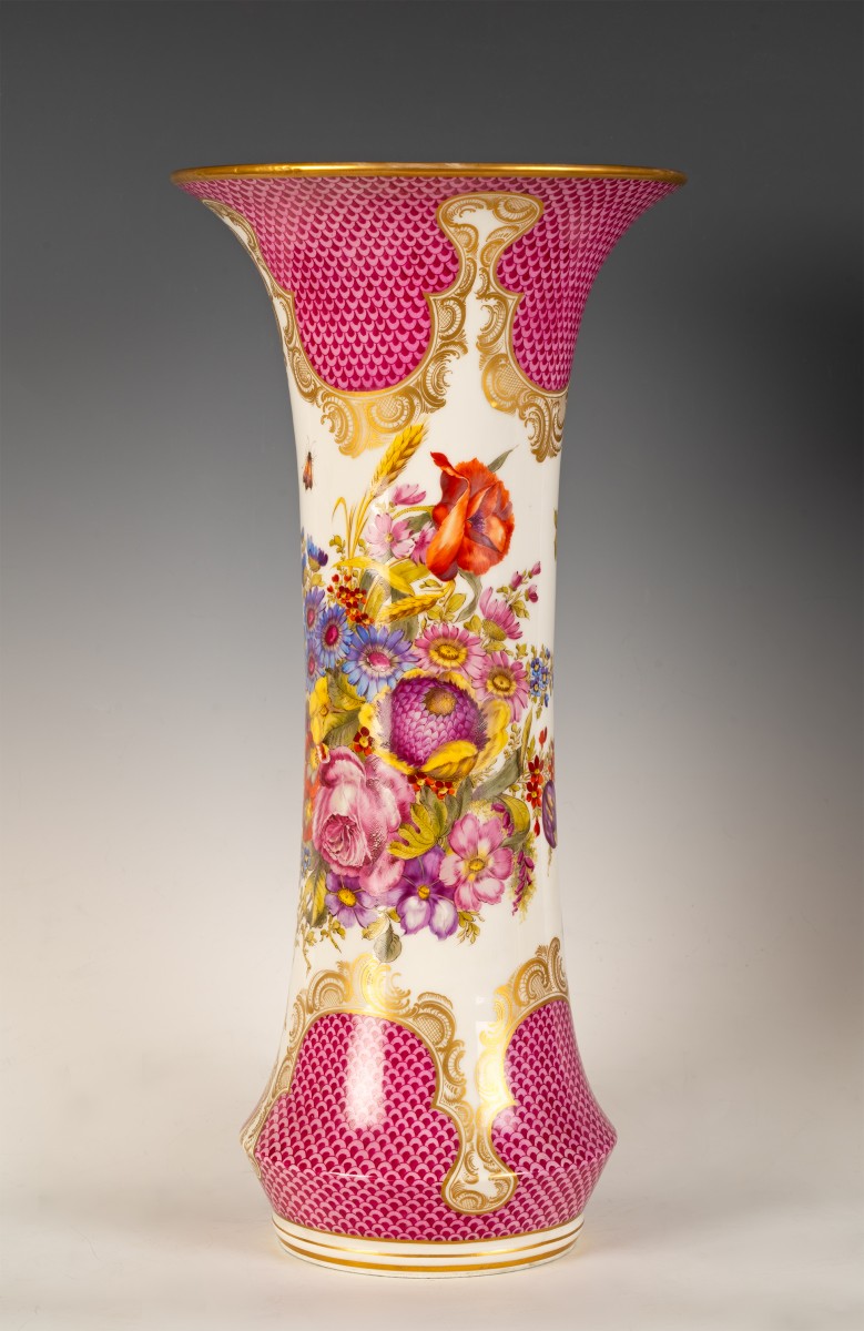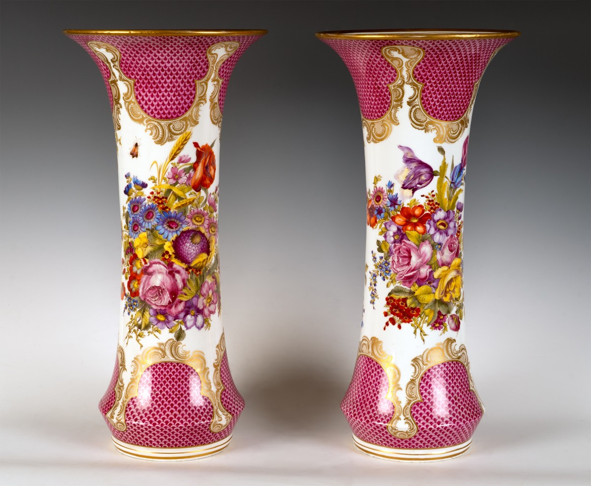 Ils sont composés d’un décor compartimenté alternant réserves blanches et fonds colorés. Le fond rose soutenu, traité en motif d’écailles superposées, évoque le célèbre décor dit “Schuppenmuster” (motif d’écailles), fréquemment employé à Meissen au XVIII? siècle et repris au XIX? dans un esprit historiciste. Ce treillis régulier, peint en dégradé de rose carmin à rose pâle, crée un effet de profondeur optique. Des cartouches de style rocaille, composés de volutes et de feuilles d’acanthe dorées, encadrent les scènes florales et délimitent les zones colorées.
