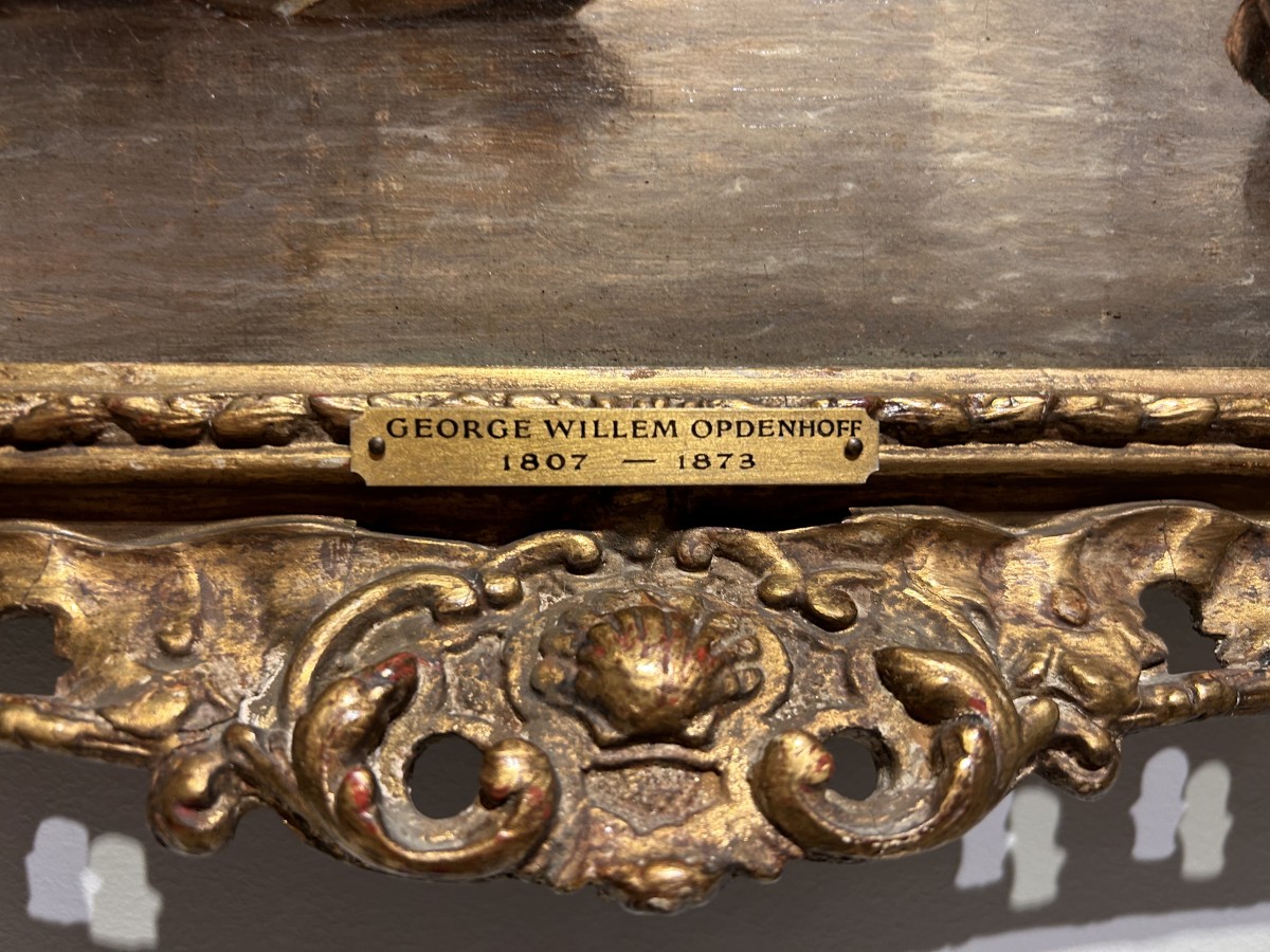 Huile sur toile représentant des bateaux au bord de rivage. Signé George Willem Opdenhoff, peintre hollandais né en 1807 à Fulda en Allemagne et décédé en 1873.