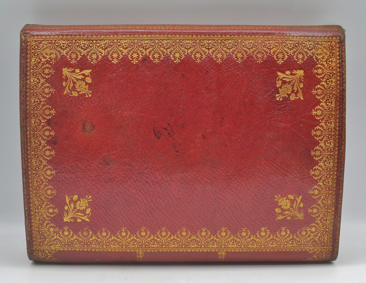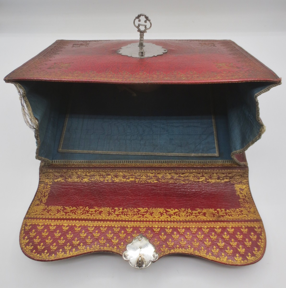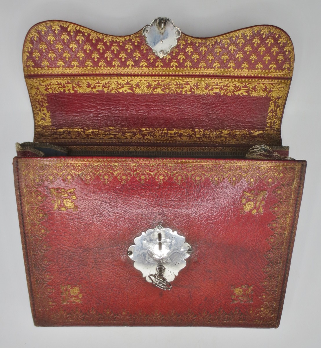 Ce beau maroquin en cuir rouge est doré au fer sur le pourtour et sur le rabat d'une frise de motifs floraux, et chaque angle est frappé d'un écoinçon représentant un petit bouquet fleuri. L’intérieur divisé en deux parties est garnie d'une soie bleu moirée et l' envers du rabat et richement doré d'une frise de motifs animaliers tels que oiseau, bouc, renard, cigogne alternés de bouquets de fleurs. La serrure en argent massif a conservée sa très belle clef d'origine dont le canon est triangulaire et l'anneau joliment découpé et ajouré. Le poinçon de contrôle frappé sur la serrure est une tête de coq tournée vers la gauche en vigueur de 1750 à 1756 à Paris.