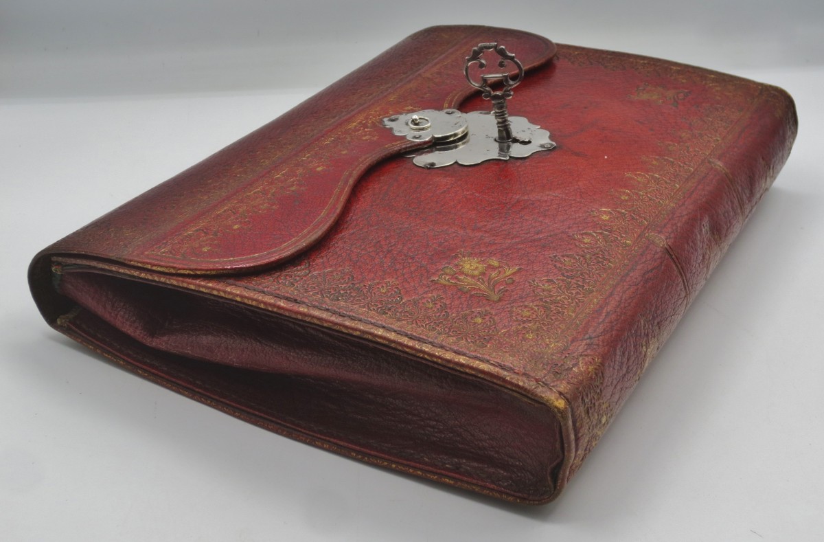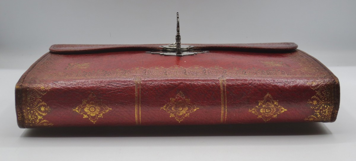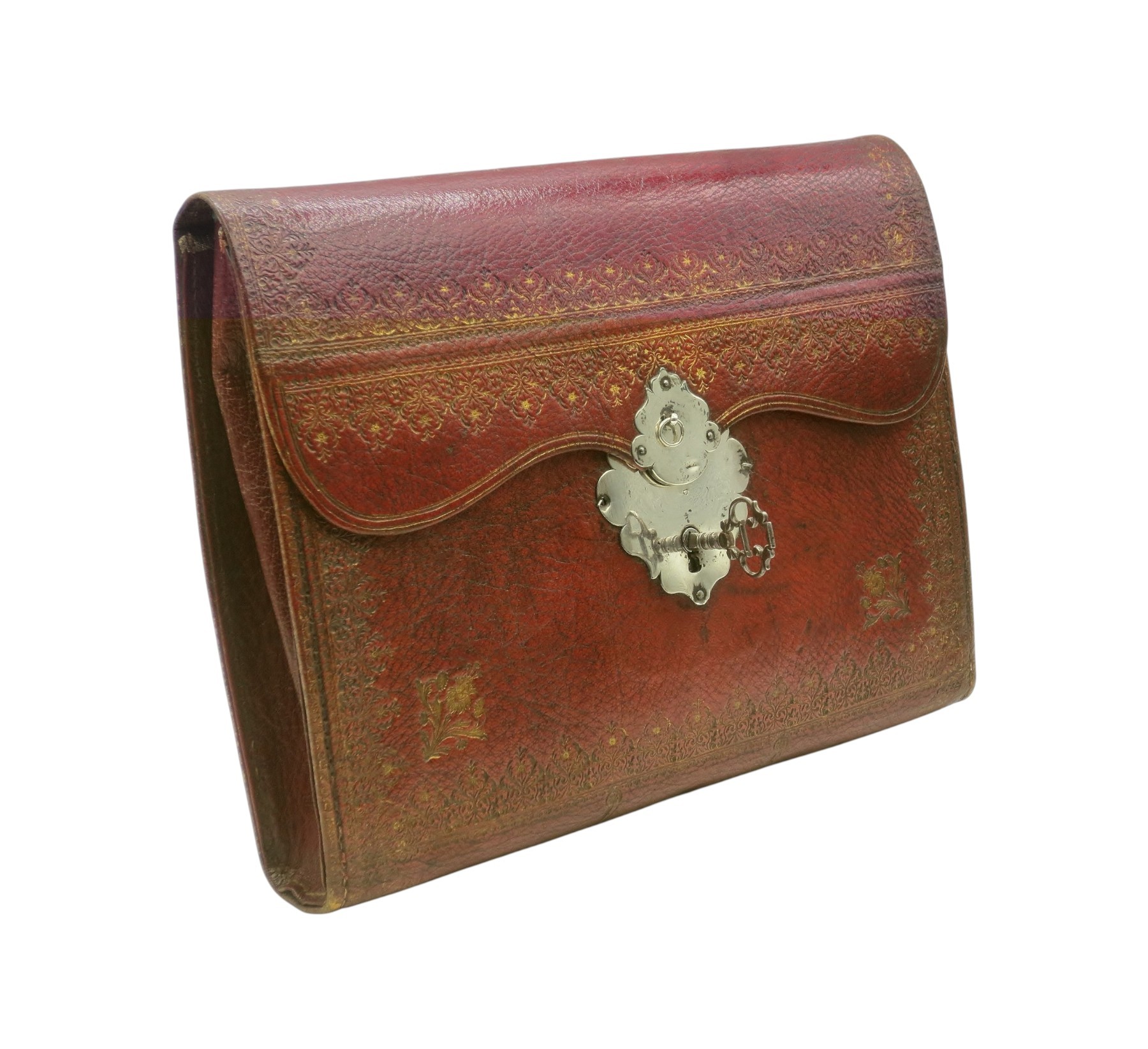 Ce beau maroquin en cuir rouge est doré au fer sur le pourtour et sur le rabat d'une frise de motifs floraux, et chaque angle est frappé d'un écoinçon représentant un petit bouquet fleuri. L’intérieur divisé en deux parties est garnie d'une soie bleu moirée et l' envers du rabat et richement doré d'une frise de motifs animaliers tels que oiseau, bouc, renard, cigogne alternés de bouquets de fleurs. La serrure en argent massif a conservée sa très belle clef d'origine dont le canon est triangulaire et l'anneau joliment découpé et ajouré. Le poinçon de contrôle frappé sur la serrure est une tête de coq tournée vers la gauche en vigueur de 1750 à 1756 à Paris.