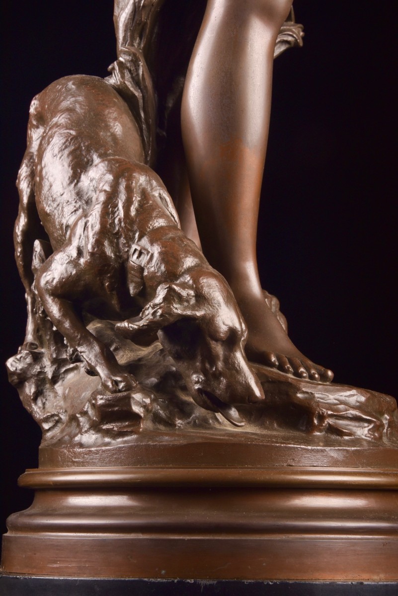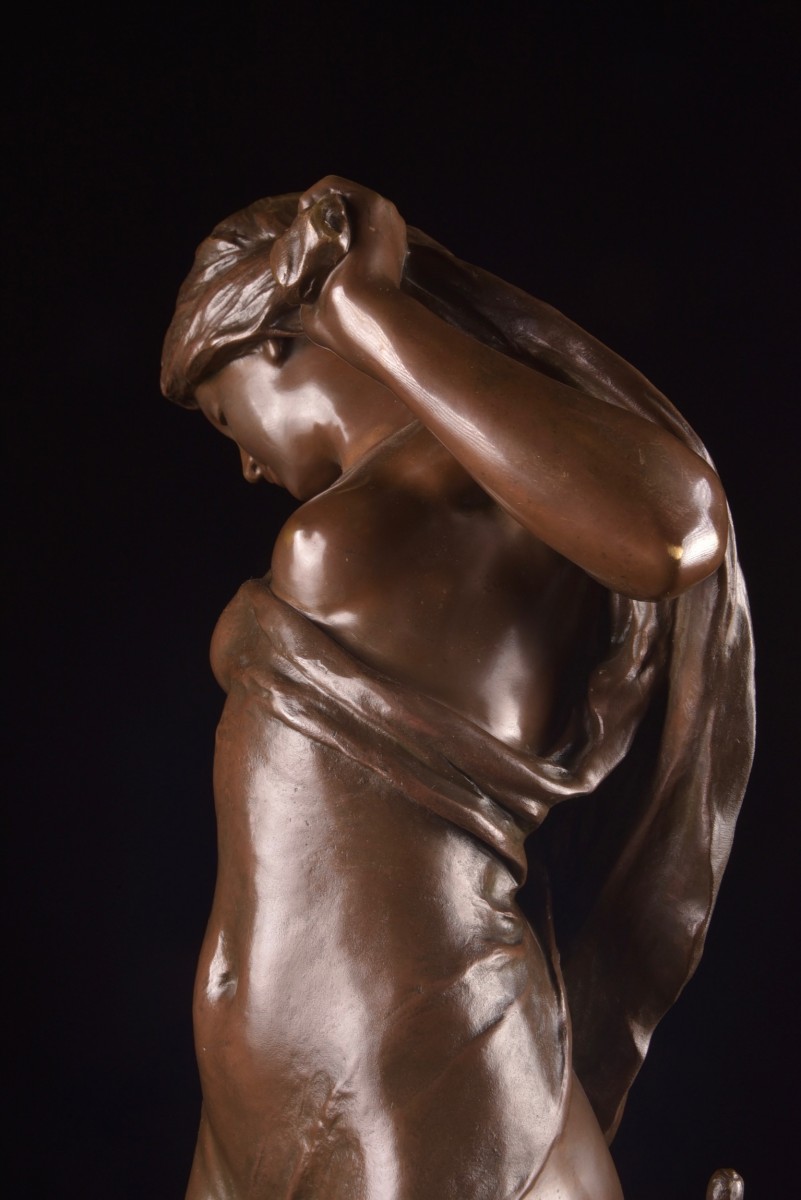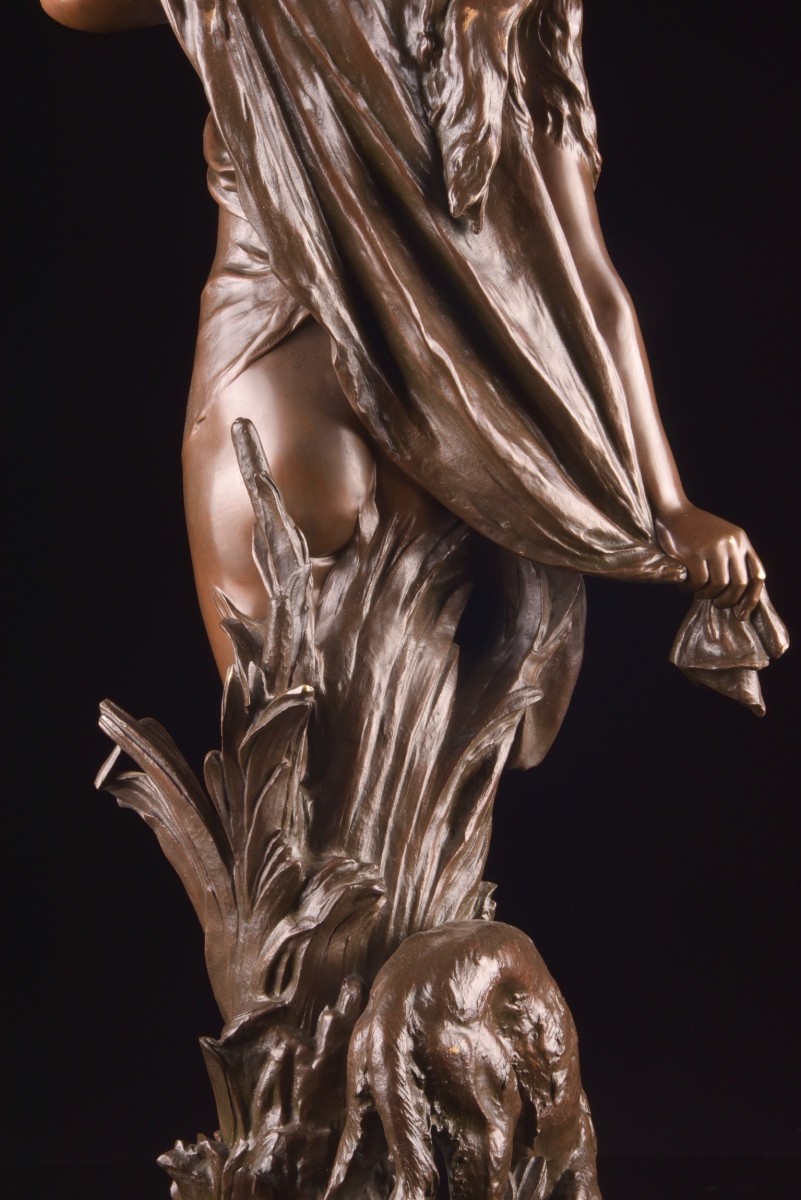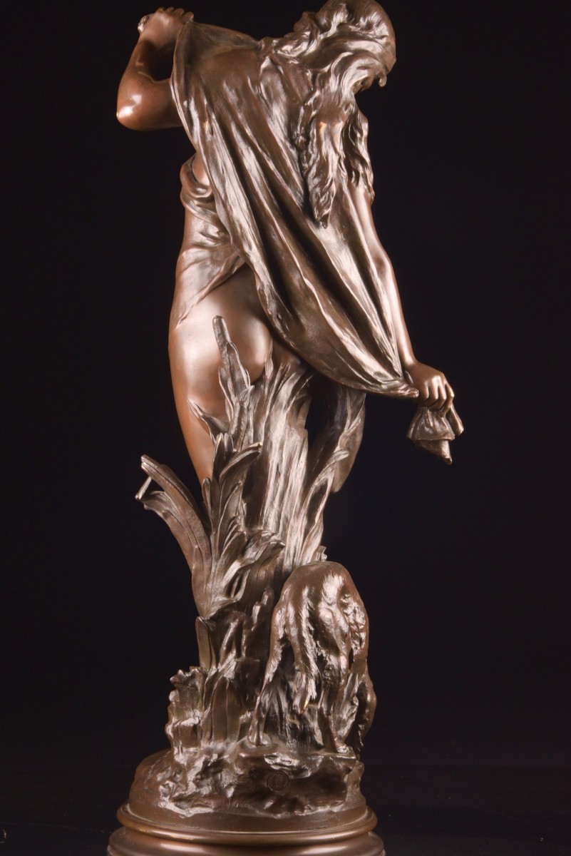 Sculpture en bronze à patine brune réalisée par le sculpteur français Mathurin Moreau (1822–1912), représentant « Diane au Bain ». La déesse est figurée dans une posture élégante et intime, avec un modelé classique et un traitement raffiné des détails.