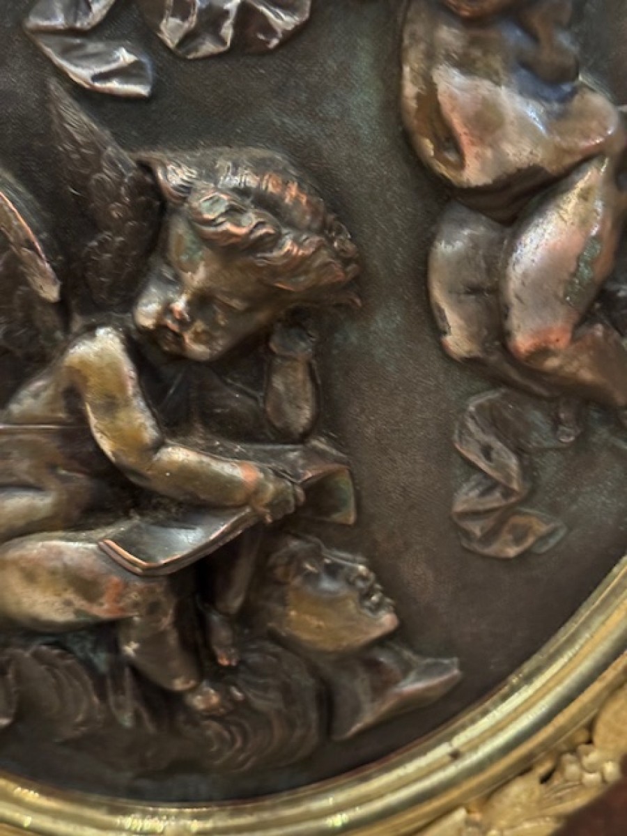 Le médaillon central est signé Mme Léon Bertaux,célèbre sculptrice connue en son époque pour son succès dans les expositions universelles, où elle sera déclarée hors concours. C'est la première femme à recevoir une médaille d'or dans sa spécialité.