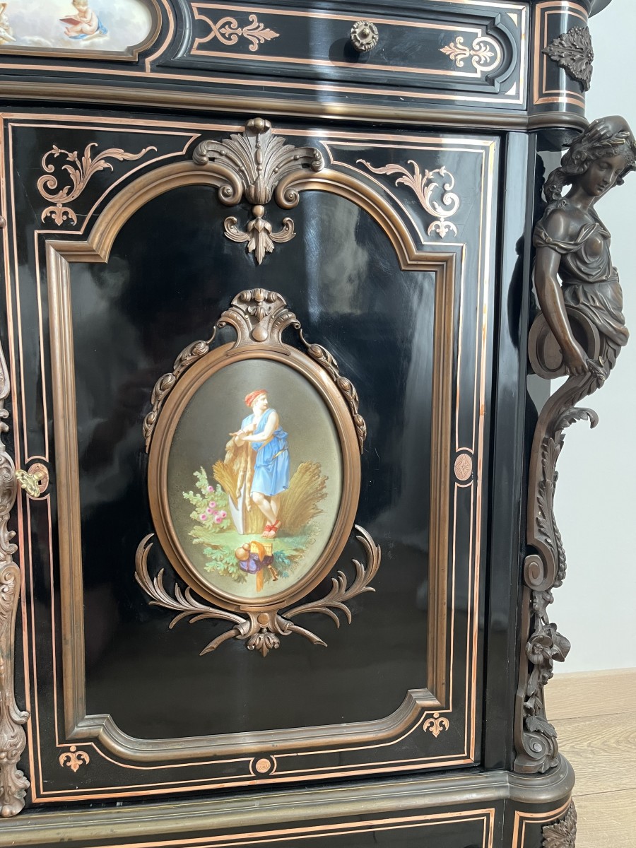Retrouver le mobilier ou les objets d''art similaires à « Meuble d'appui Napoléon III avec plaques de porcelaine » présenté par Antiquités Simon, antiquaire à Saint ouen sur Seine dans la catégorie Buffet Napoléon III, Mobilier.