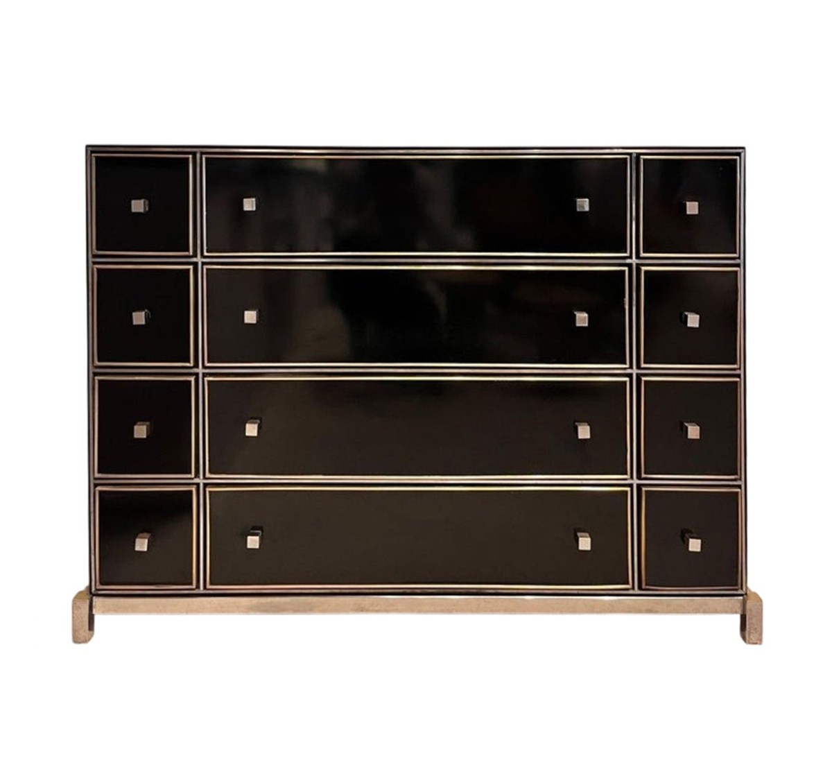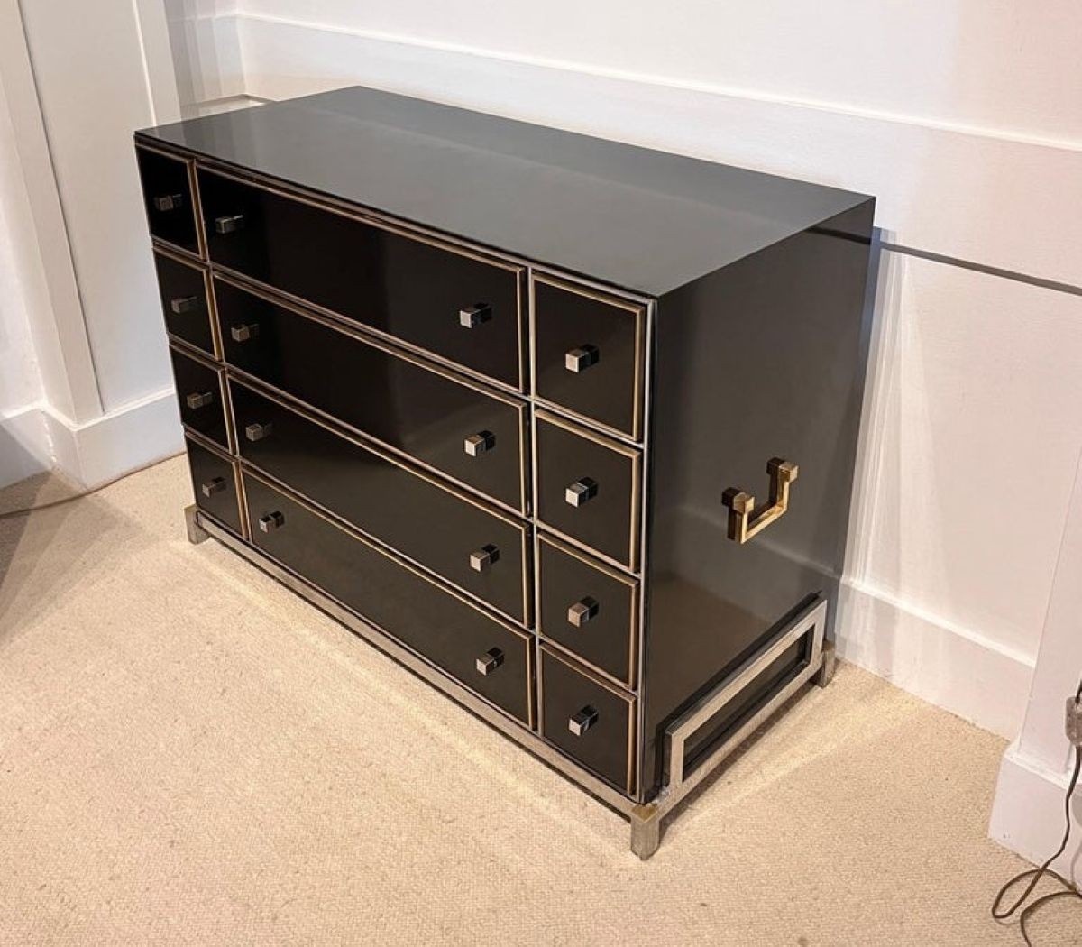 Michel Pigneres, commode, laiton, acier chromé, formica noir, France, années 1970 Douze tiroirs, de tailles différentes, offrant un espace de rangement généreux. Chaque tiroir est encadré d'une bordure en laiton. Version avec poignées décoratives sur les côtés.