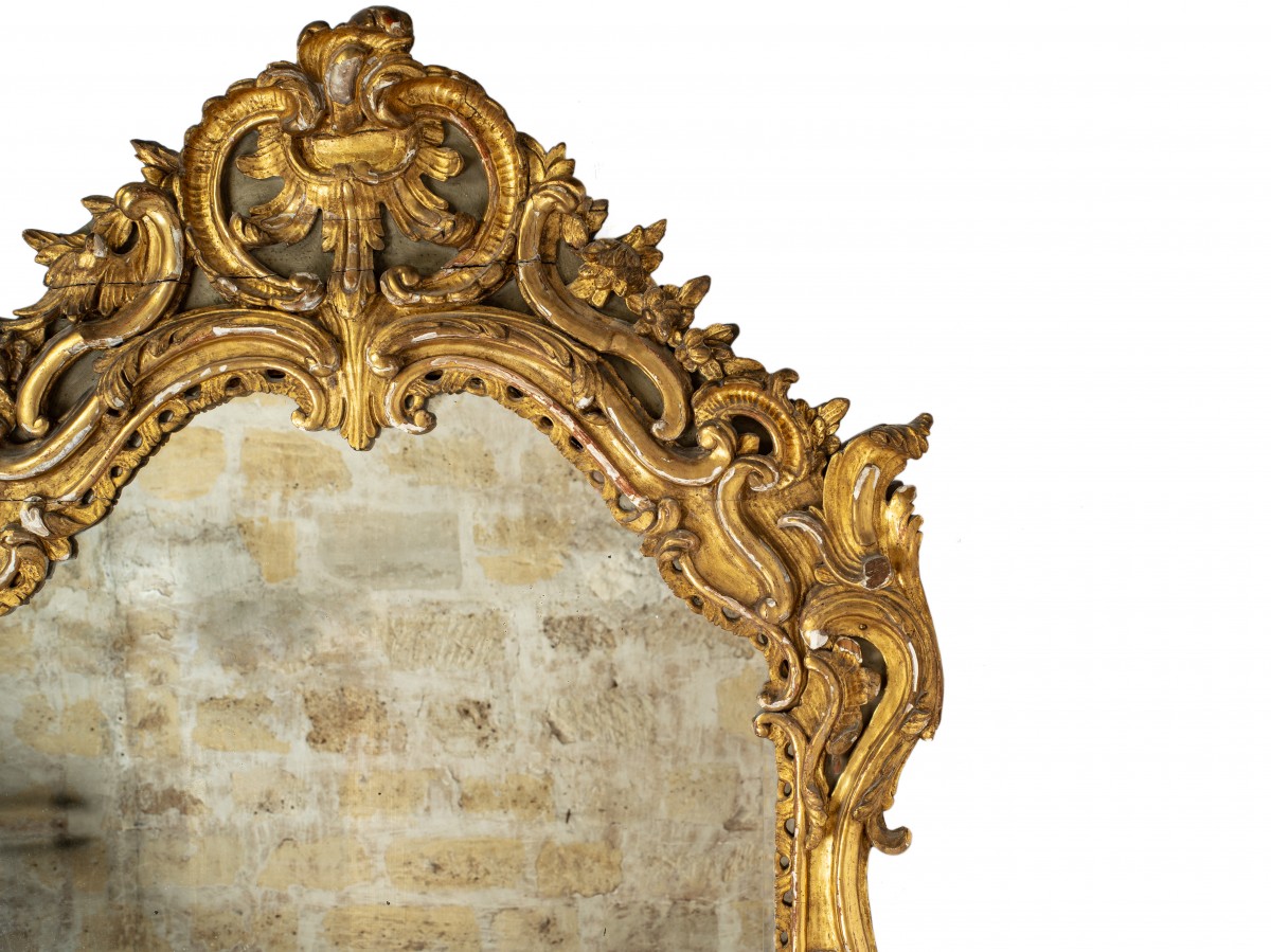 Miroir d'époque Louis XV en bois sculpté et doré à décor de volutes, de rinceaux feuillagés et de feuilles d'acanthe.
