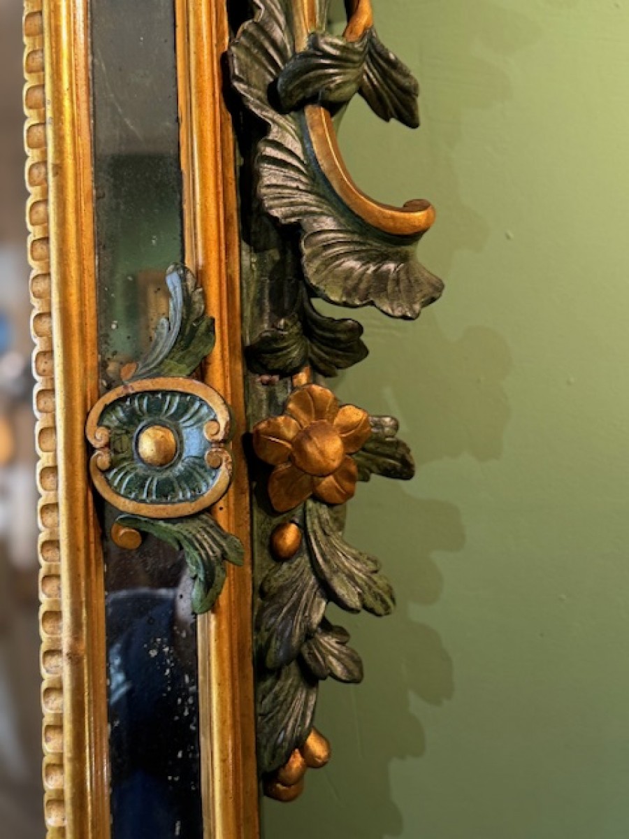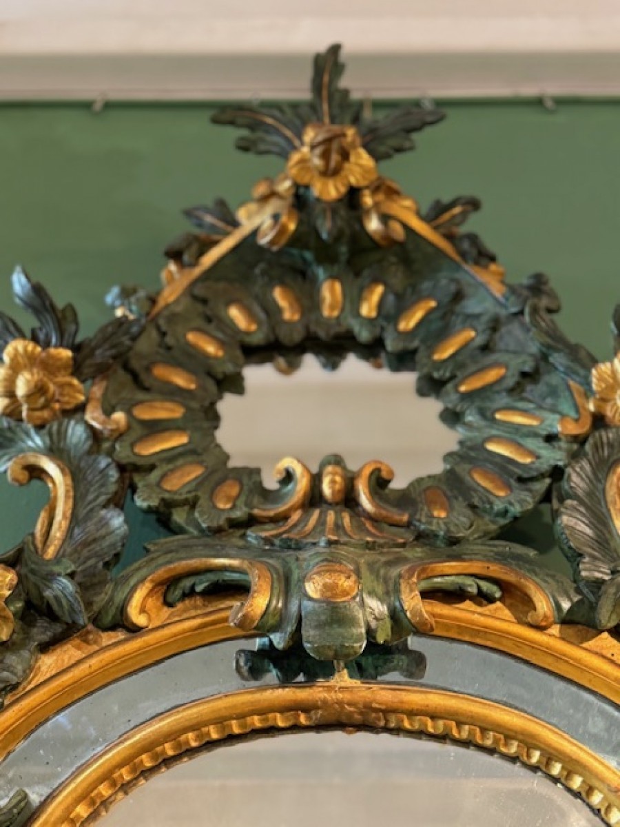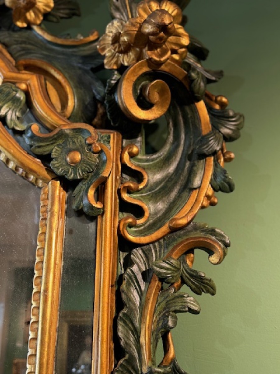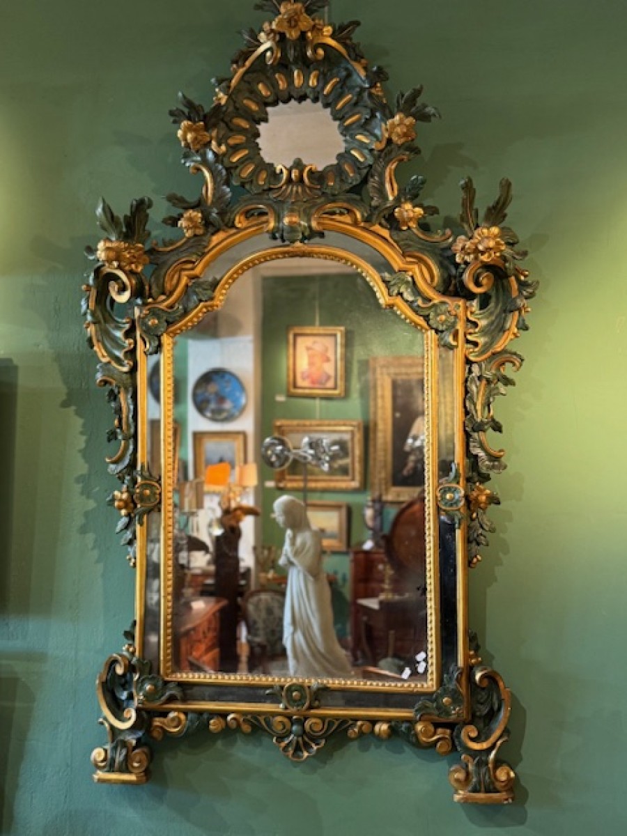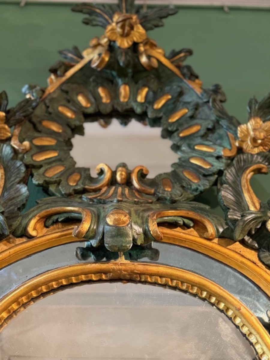 Miroir Vénitien en bois peint en vert et doré d'époque Louis XV très beau travail de sculpture de feuilles d'acanthe peinture et dorure reprises au 19ème .