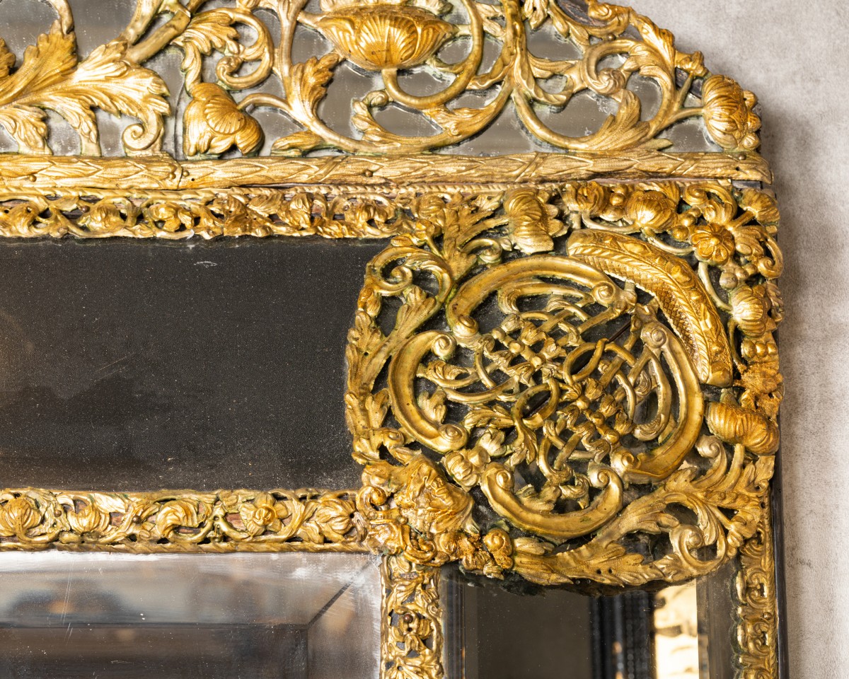 Miroir rectangulaire à parecloses et fronton ornementé de clinquants en laiton repoussé et doré .