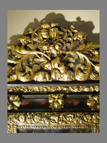 Il est à parecloses imitant l’écaille de tortue et encadré de laiton repoussé. Le fronton à beau et généreux décor de rinceaux, de feuillages et de fruits. La glace centrale à profil inversé dans un encadrement d’une large bande de laiton repoussé à motifs végétaux. Il est enrichi aux angles d’écoinçons et encadré de baguettes de bois noirci mouluré.