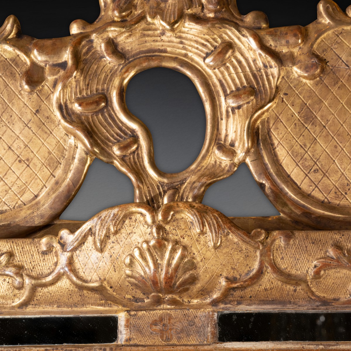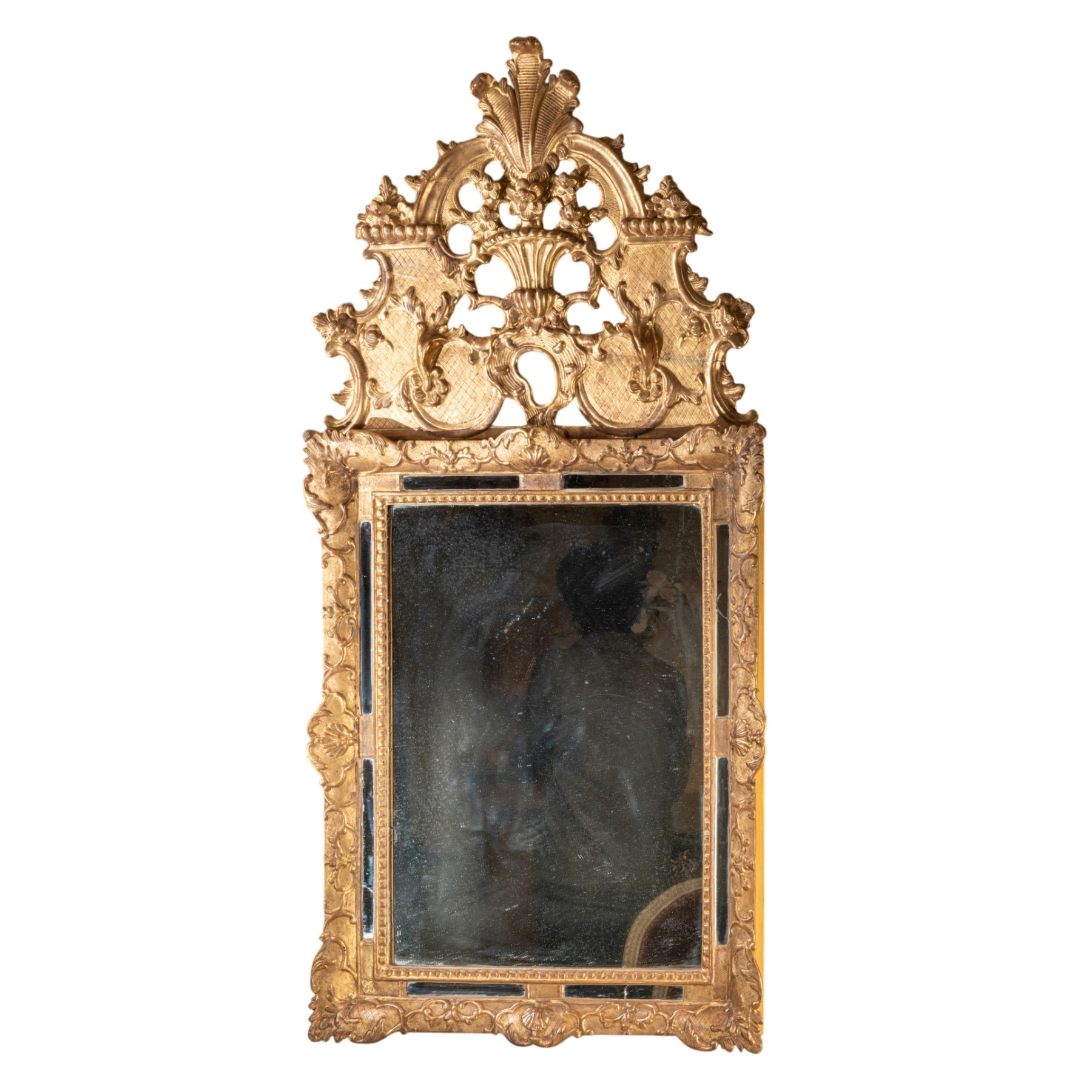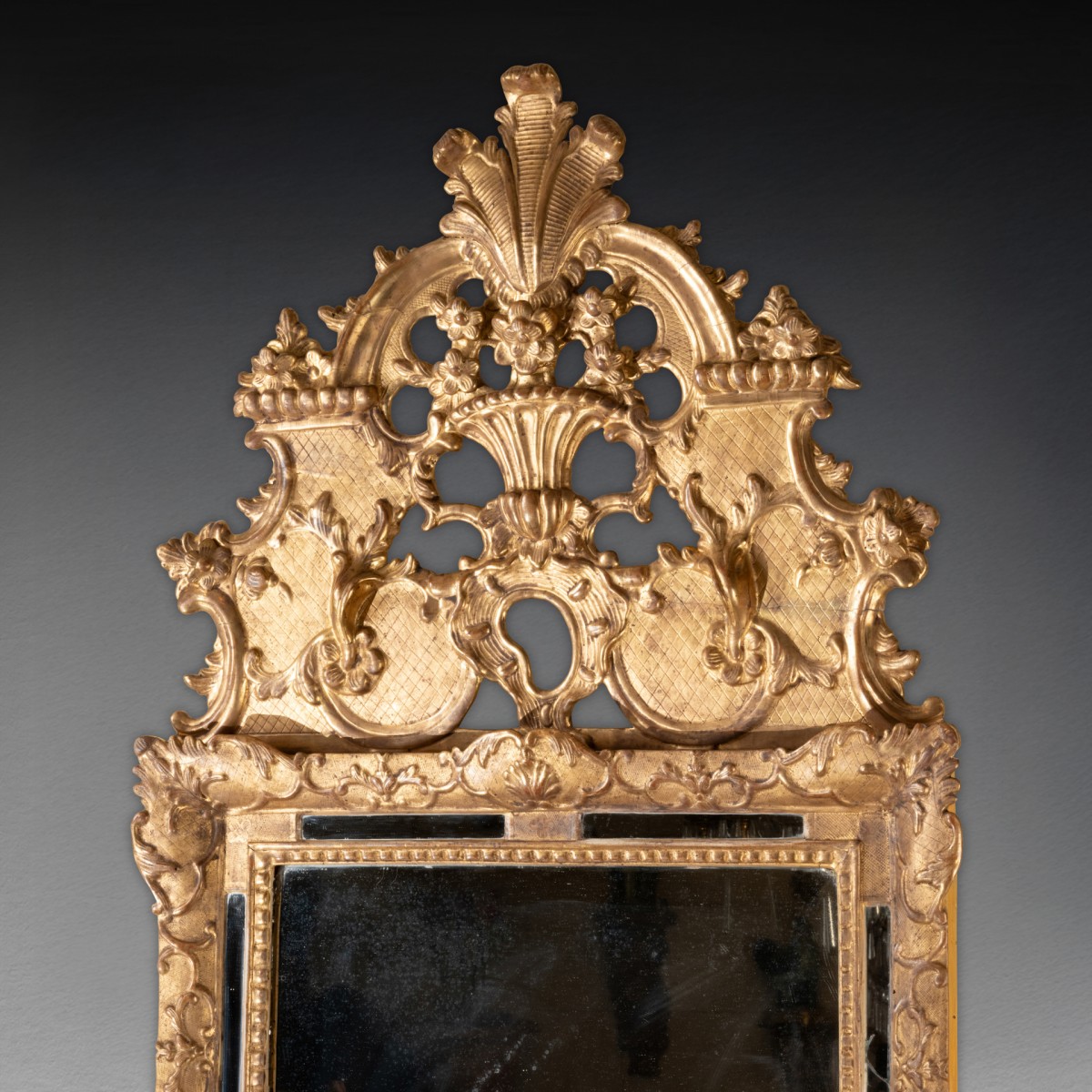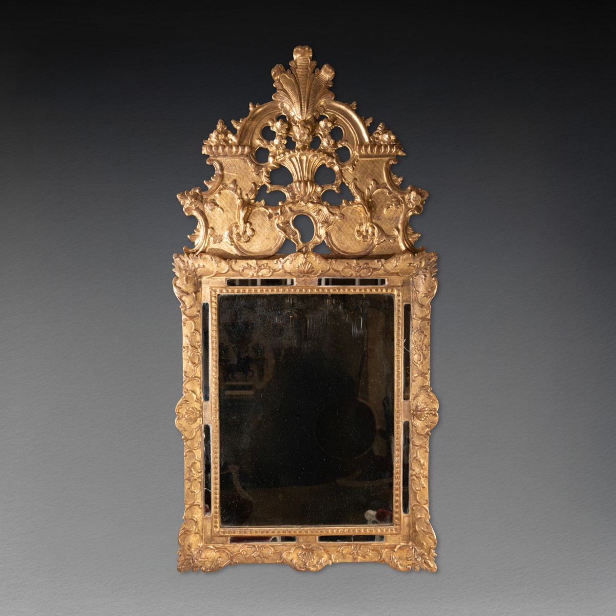 Miroir composé d'un encadrement de bois sculpté et doré, à pare closes de miroirs, décoré d'écoinçons d'angles, agrémenté d'un fronton supérieur de forme chantournée, en bois sculpté et doré ; surmonté d'un large cintre décoré d'une coquille surmontant un vase fleuri dans un à jour.