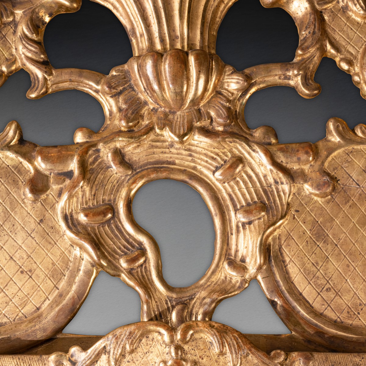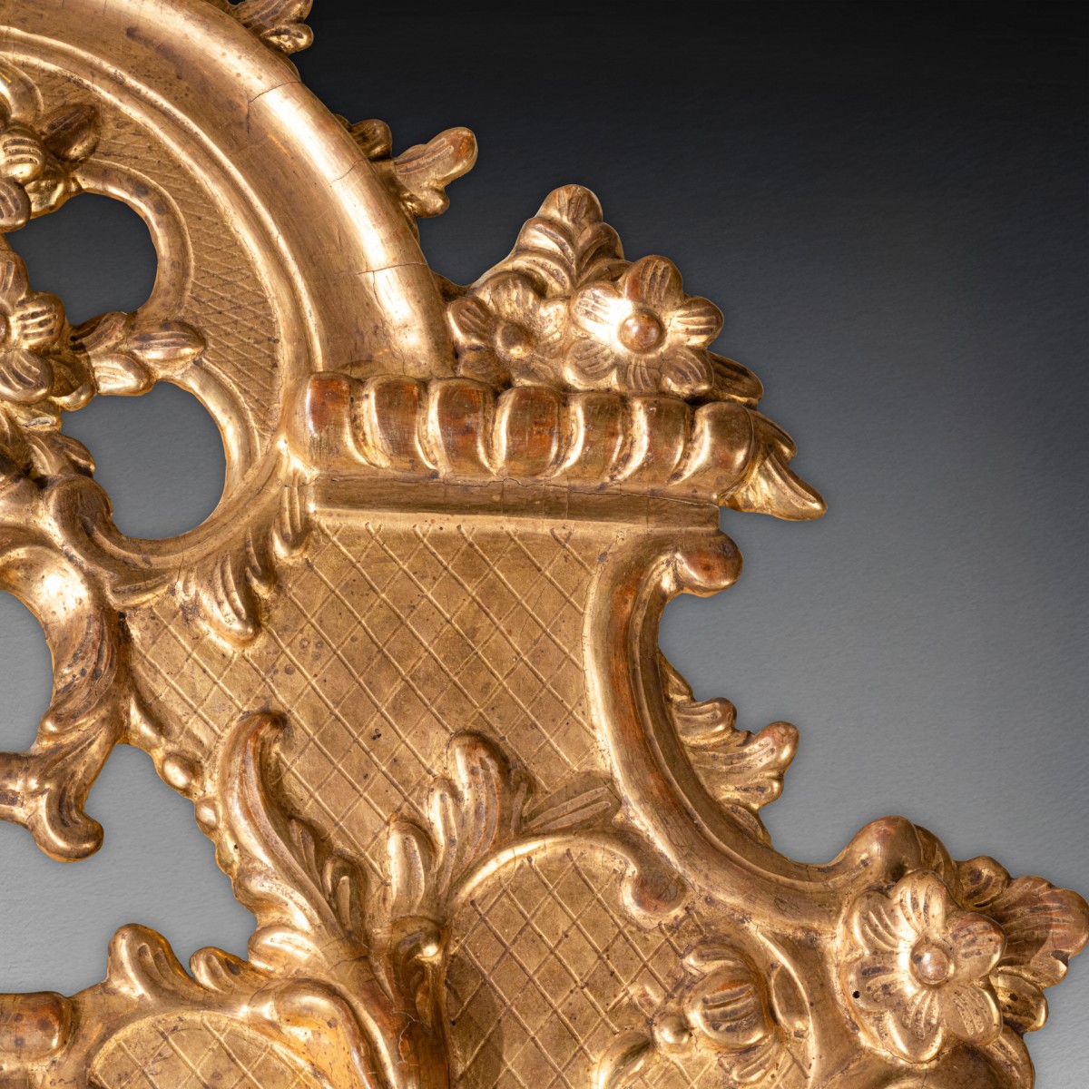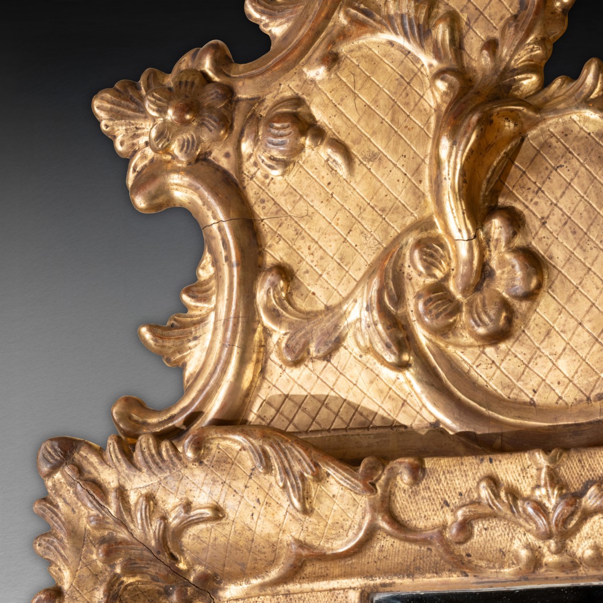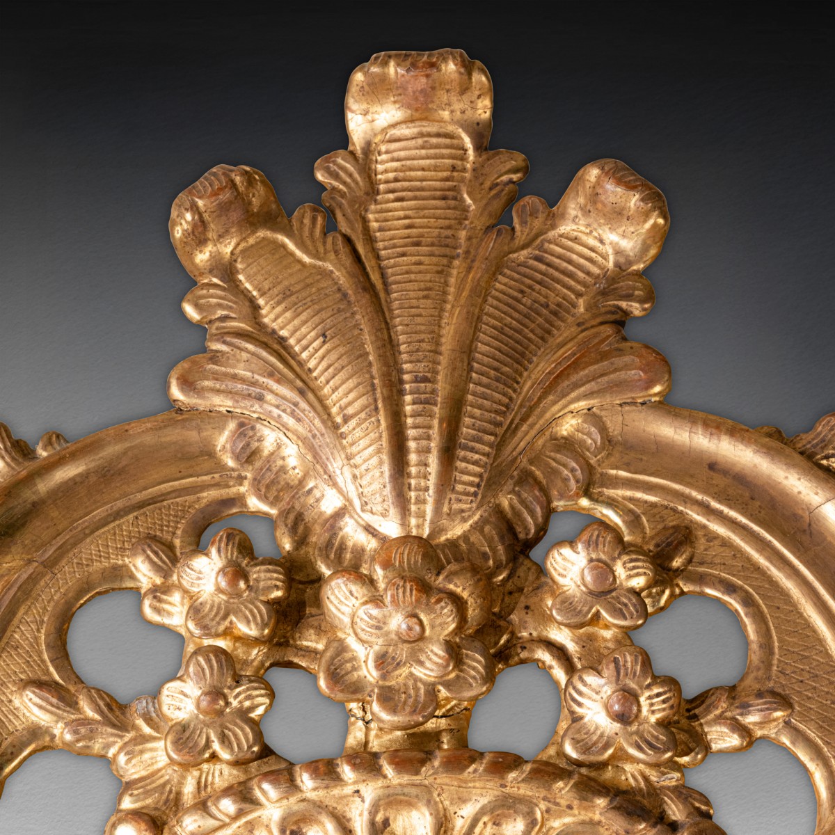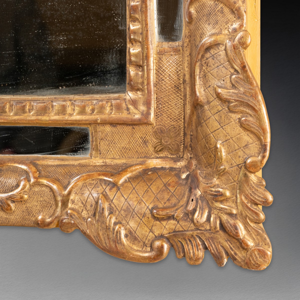 Miroir composé d'un encadrement de bois sculpté et doré, à pare closes de miroirs, décoré d'écoinçons d'angles, agrémenté d'un fronton supérieur de forme chantournée, en bois sculpté et doré ; surmonté d'un large cintre décoré d'une coquille surmontant un vase fleuri dans un à jour.