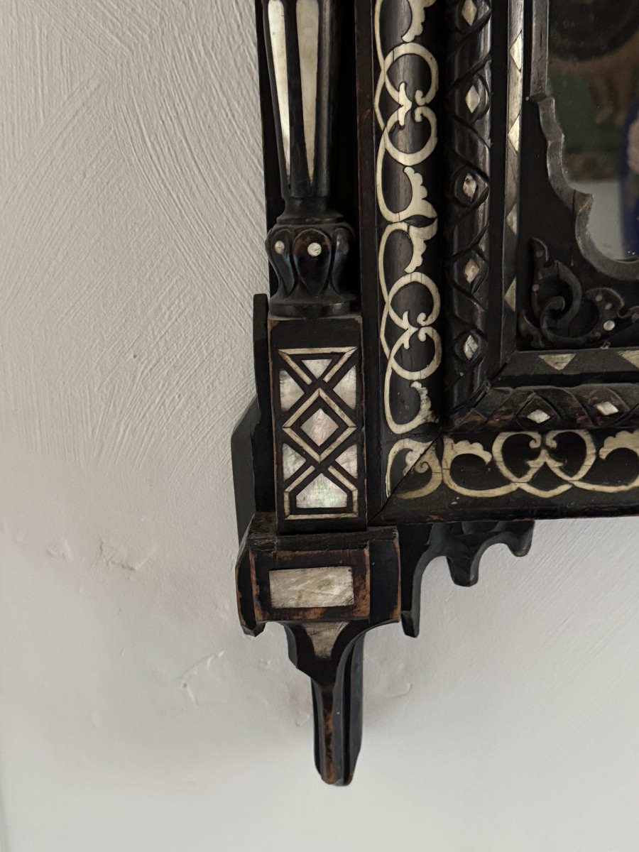 Miroir à colonnettes en bois exotique à décor de rinceaux et entrelacs , incrustés en os et en nacre .