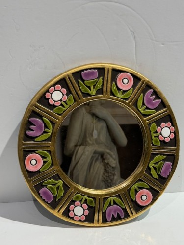 Miroir de forme ronde de Mithé espelt à décor de fleurs en terre vernissé .