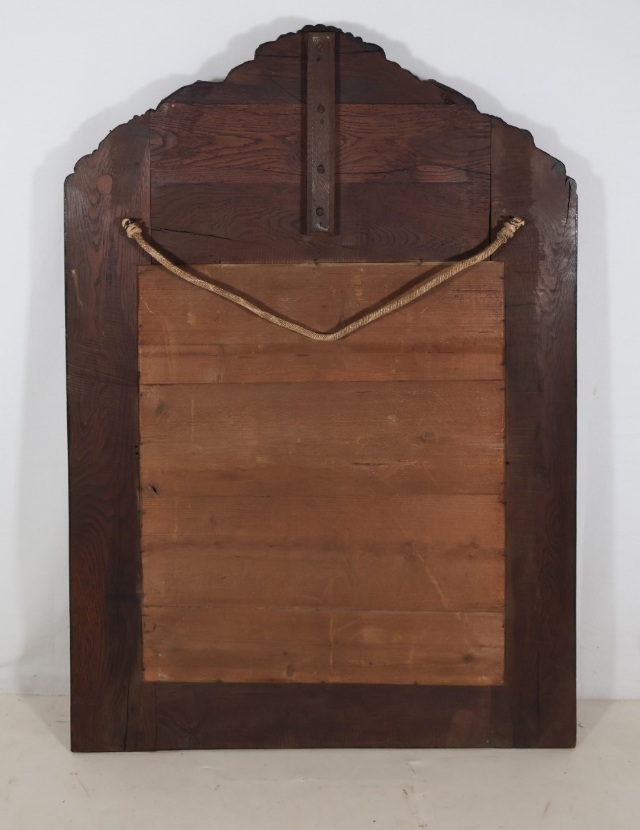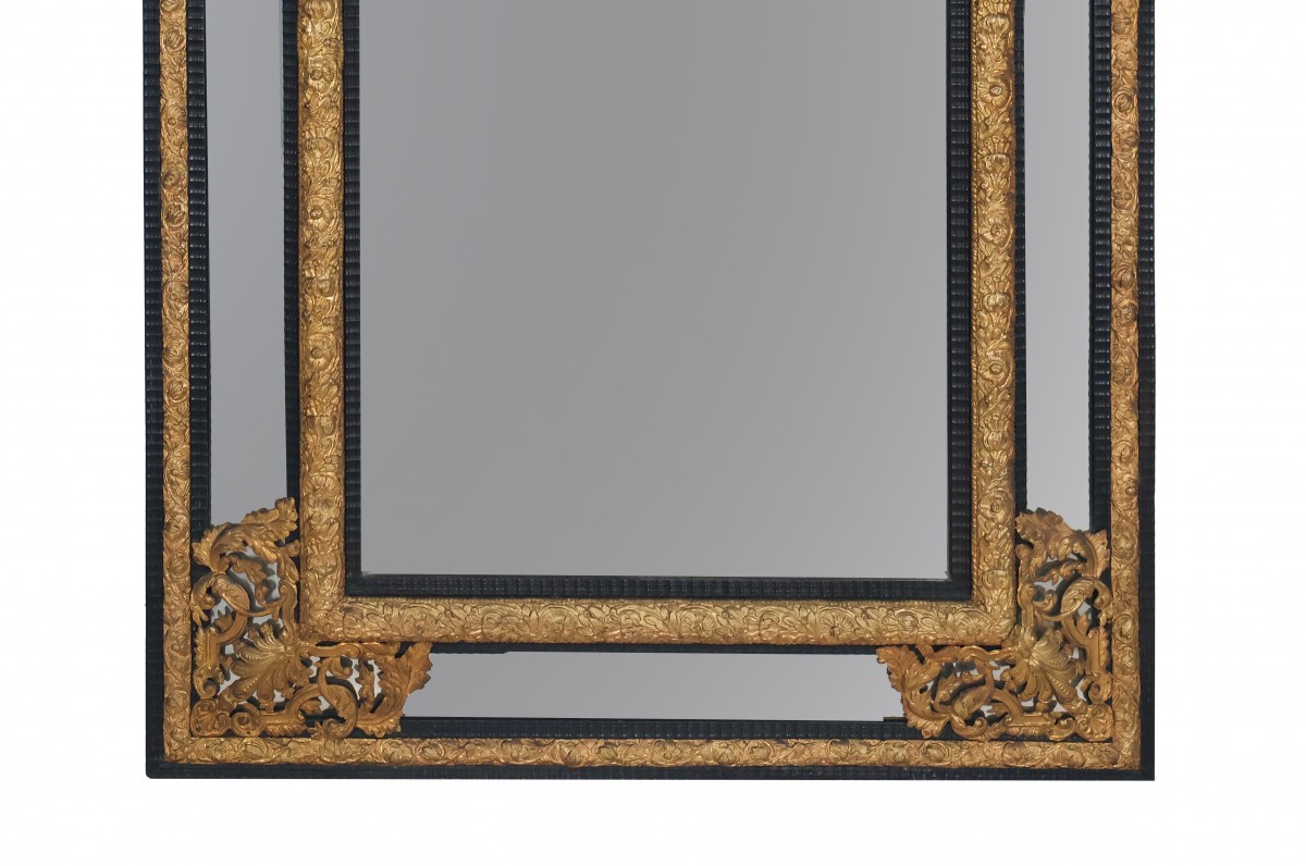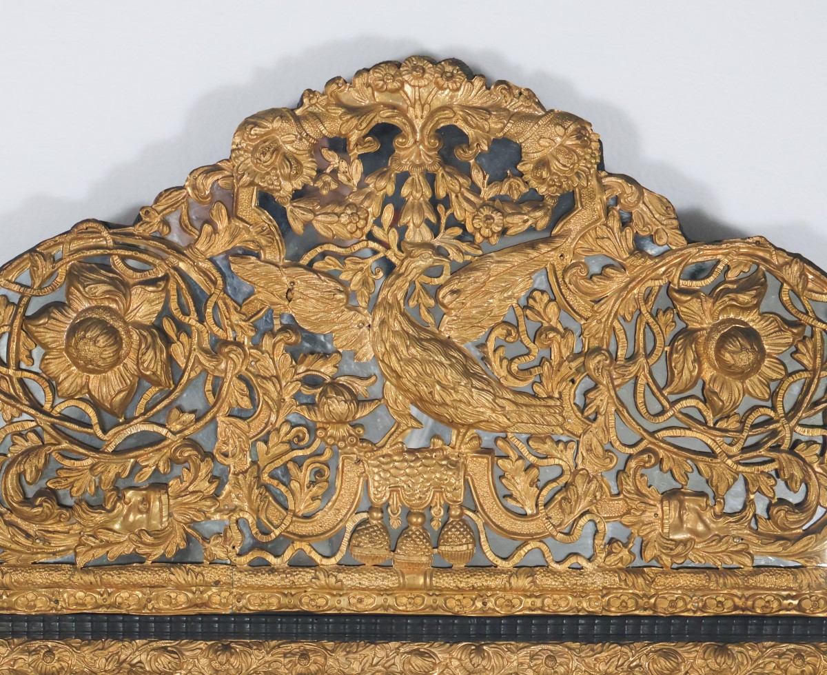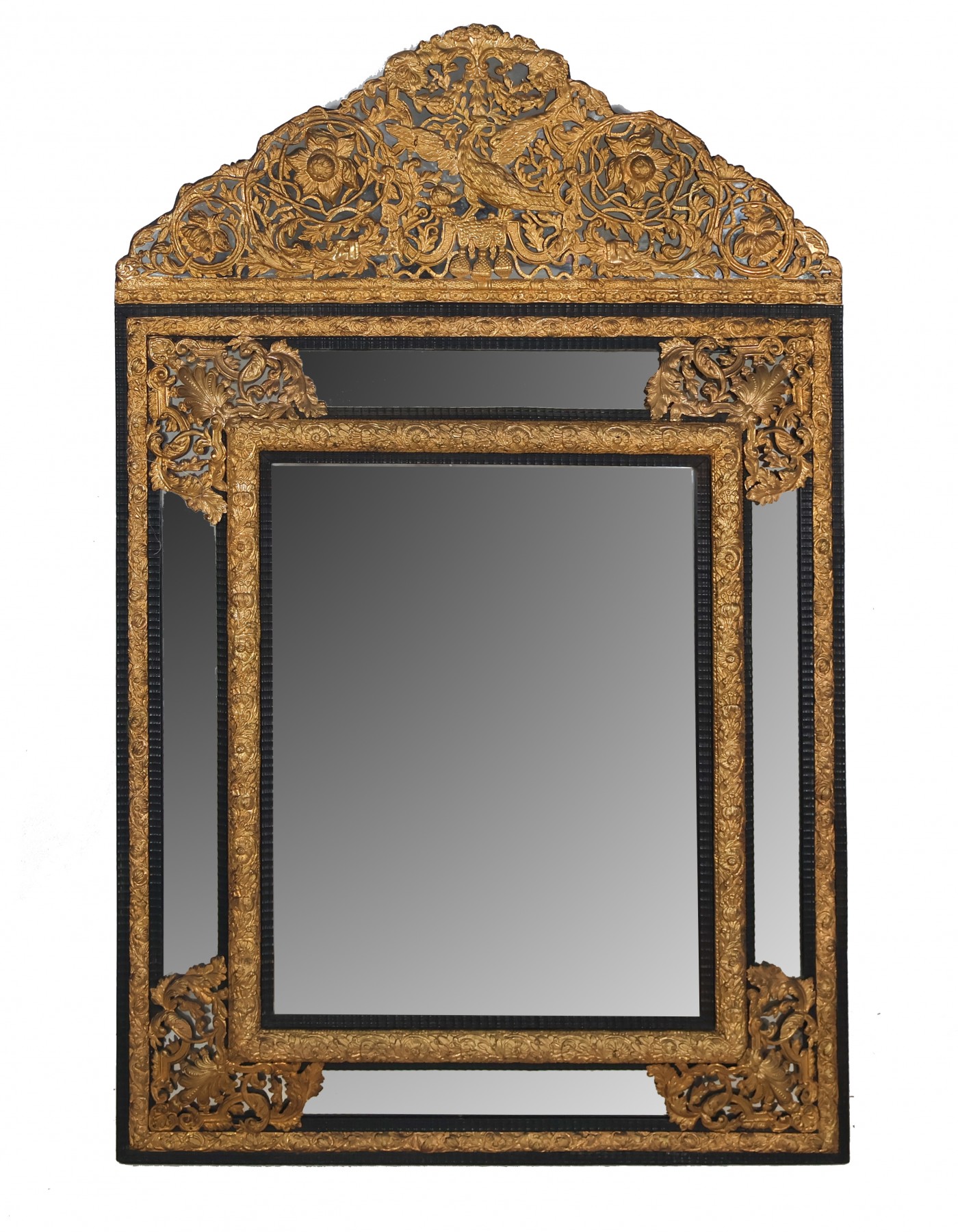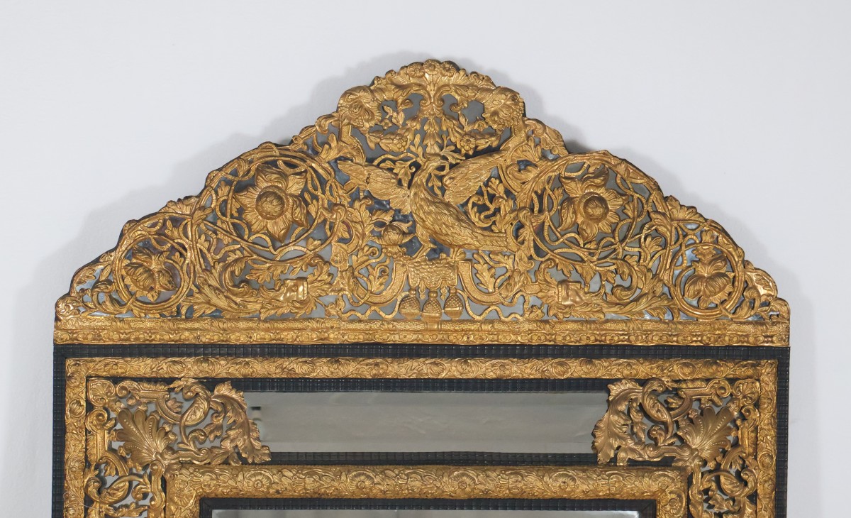 La glace centrale en verre biseauté possède un double encadrement de bois sculpté et de frises de fleurs en cuivre enrichi aux angles d'écoinçons à décor de feuilles d’acanthe