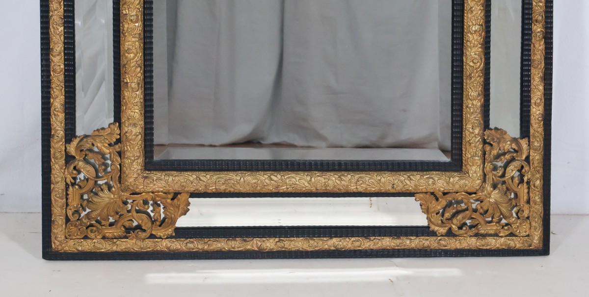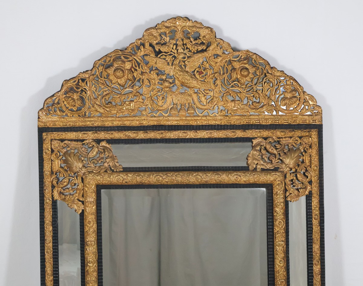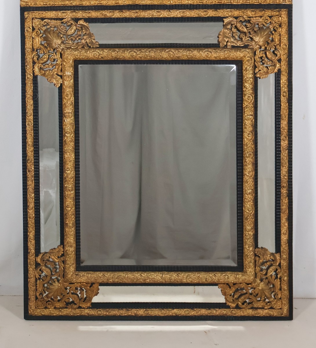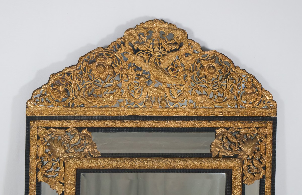 Miroir à parcloses de style Louis XIV en bois noirci et riche décor de cuivre repoussé et doré circa 1870