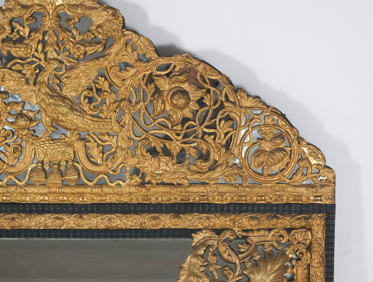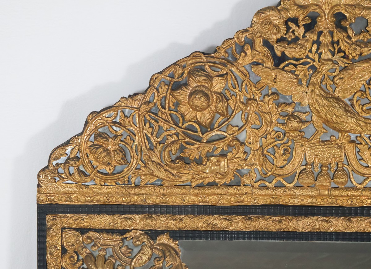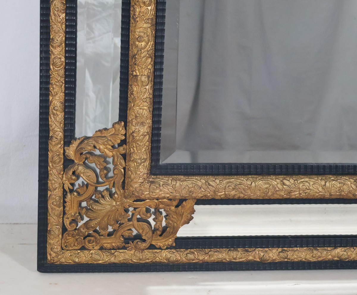 Miroir à parcloses de style Louis XIV en bois noirci et riche décor de cuivre repoussé et doré circa 1870