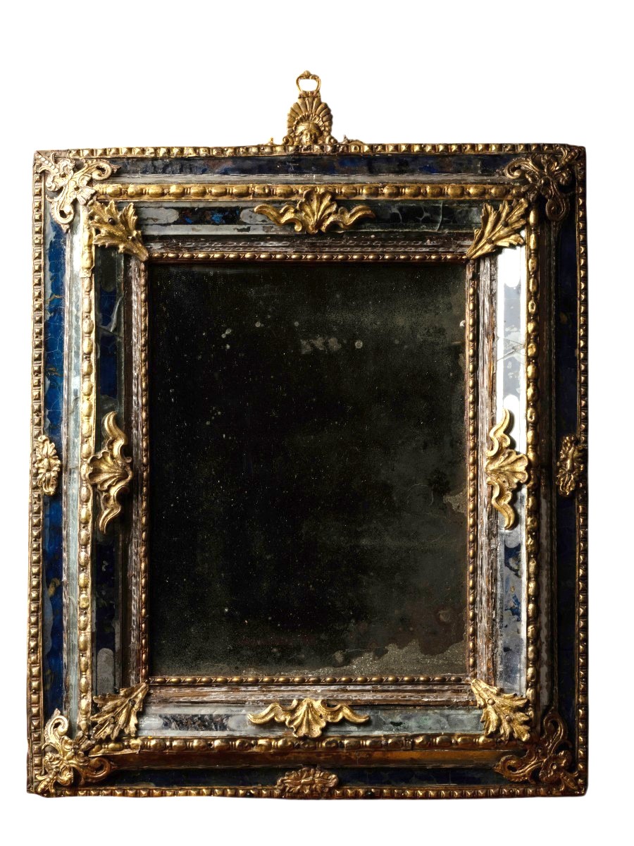 Ce type de cadre, apparu à la fin du XVIe et produit jusqu’au milieu du XVIIIe par les verriers de Murano (Morazzoni, 1951, p. 40), était destiné à la « clientèle la plus riche et la plus fastueuse » (Morazzoni, 1951, p. 40 sq.). Un miroir du même type, des collections du Museo Vetrario de Murano, est publié par Morazzoni, et il doit s’agir du « Specchio in cornice dorata e riporti di vetro colorato » inscrit au n° 939 du catalogue du musée, dans la section dédiée aux Vetri muranesi del secolo XVIII, ...