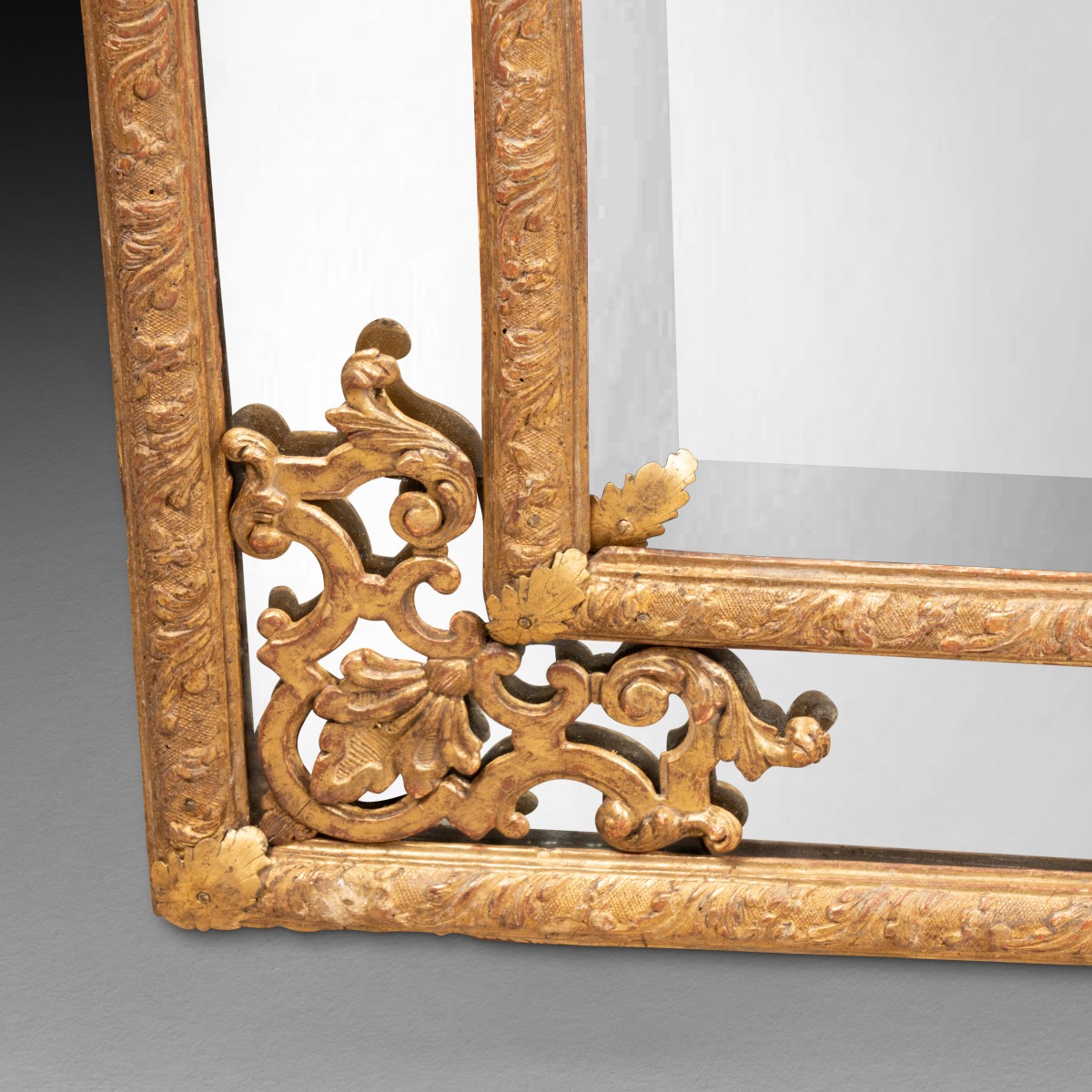 Miroir à pare closes en bois doré composé d'un miroir quadrangulaire en partie basse, composé de deux baguettes de bois doré à décor dit "à la Bérain" encadrant, par quatre écoinçons de bois doré, un miroir central biseauté, lui même encadré d'une fine baguette de miroir biseauté à quatre feuilles de laiton, doré aux angles. Le miroir est coiffé d'un large fronton orné d'une coquille centrale sur un cintre de bois doré encadré de deux coquilles latérales sur des rinceaux de feuilles.
