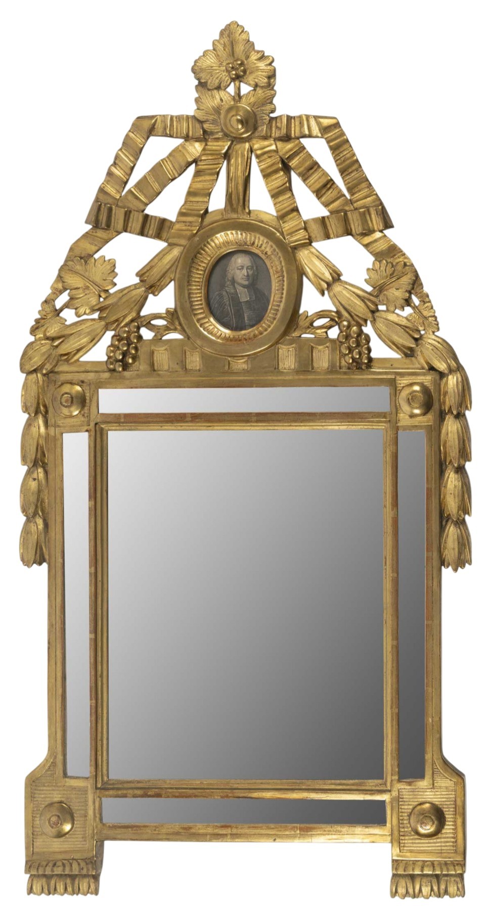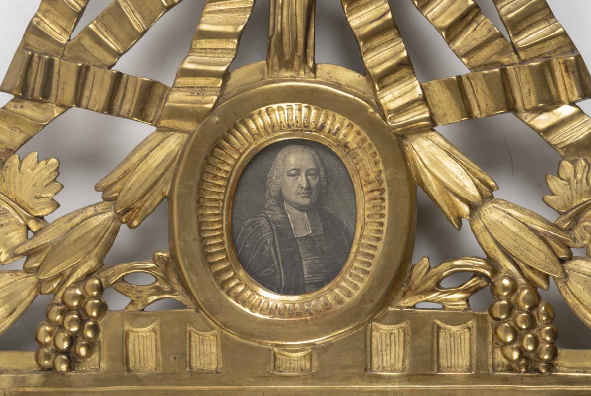 Le miroir est surmonté d'un fronton en bois doré et sculpté orné d'un médaillon représentant un parlementaire (gravure d'époque) sur lequelle repose une guirlande de feuilles de lauriers et un ruban agrémenté de grappes de raisins et de feuilles de vignes.