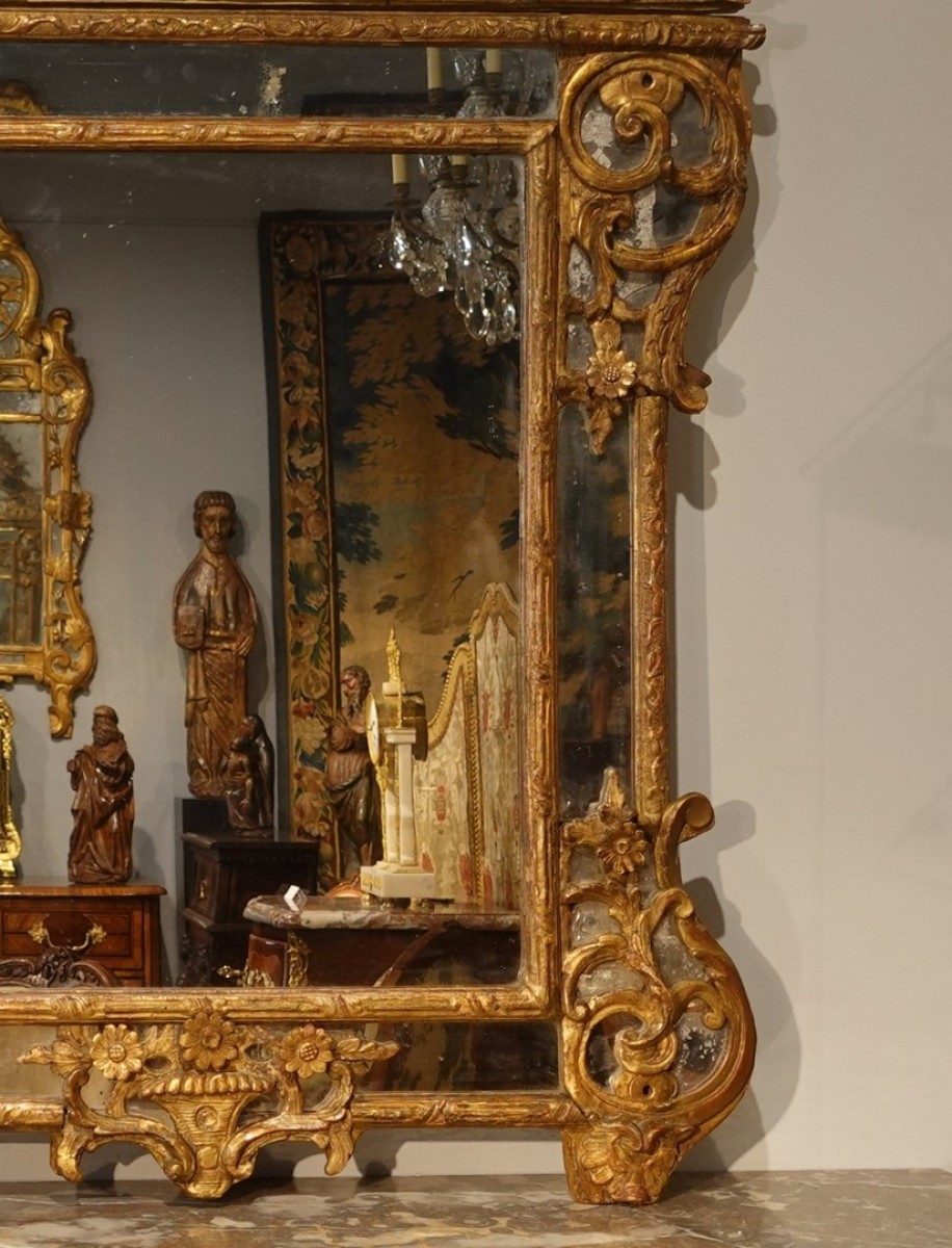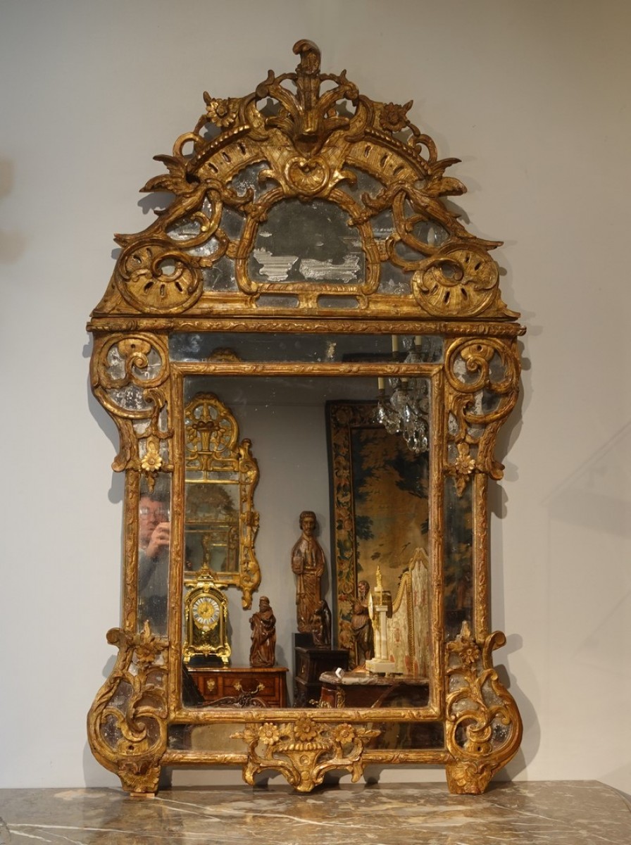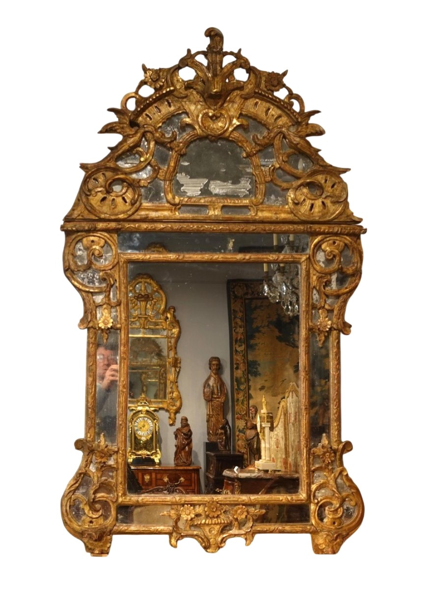 Grand miroir Régence en bois doré d'époque début XVIIIe, présentant dans sa partie centrale un double encadrement de baguettes dites ''à la Bérain''.