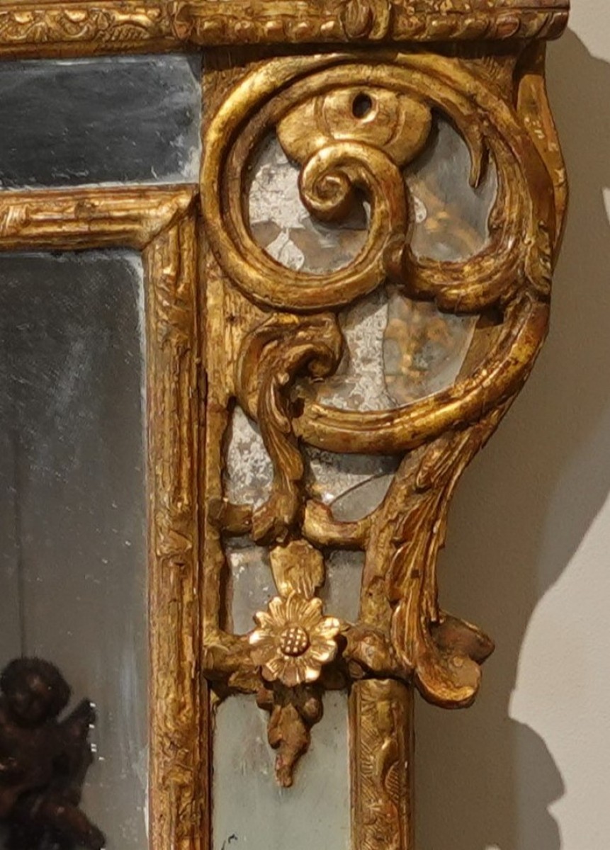 Le fronton est chantourné et on notera la finesse de son ornementation mêlant rinceaux feuillagés, coquilles, arabesques et oiseaux. Il est également sommé d'une large palmette entourée de deux paniers fleuris.