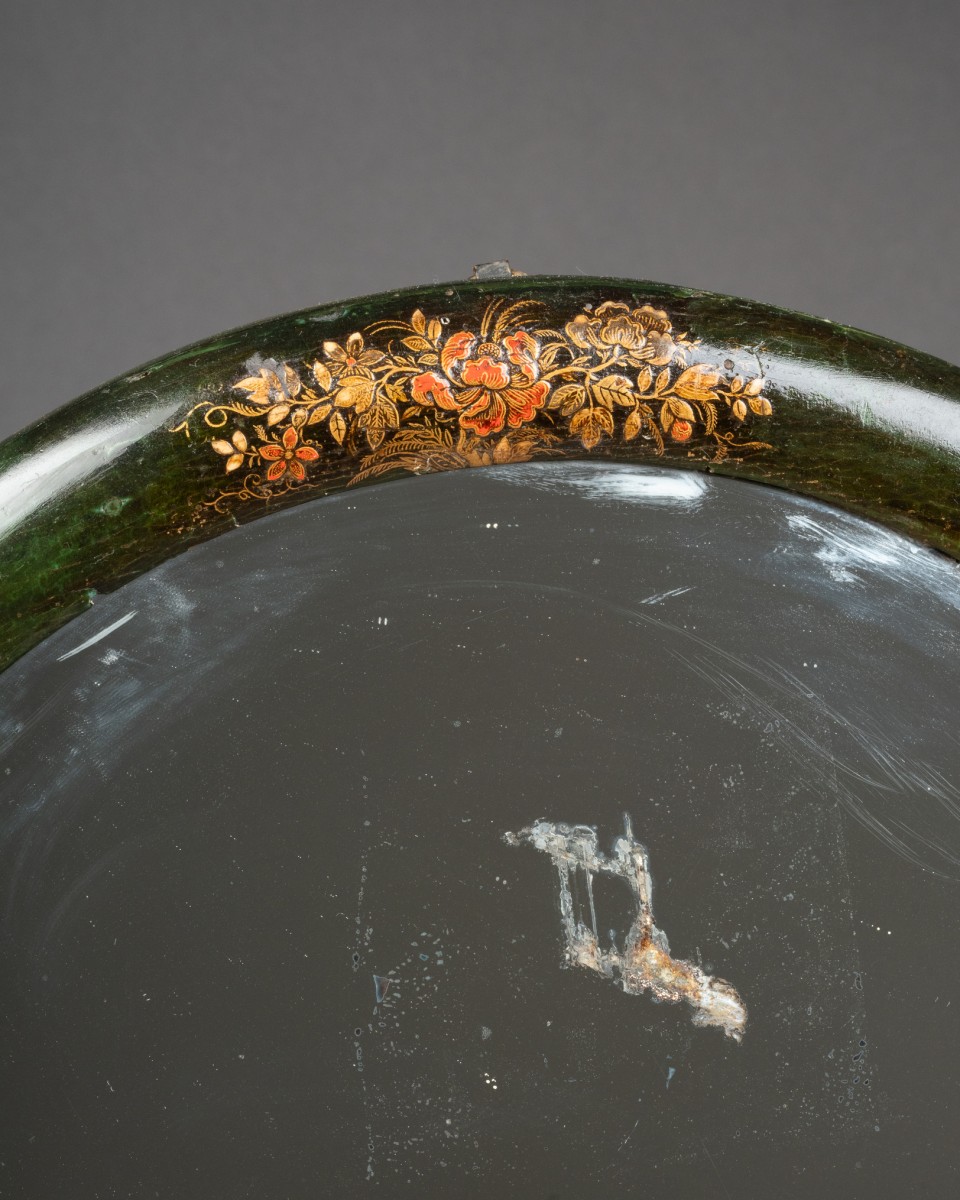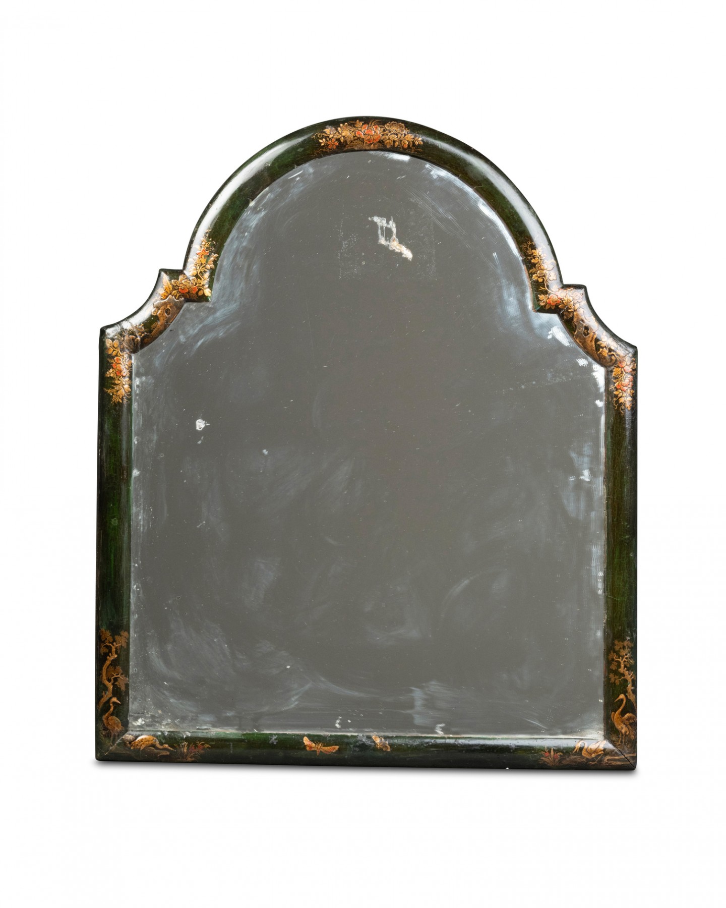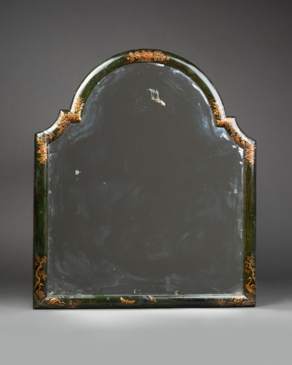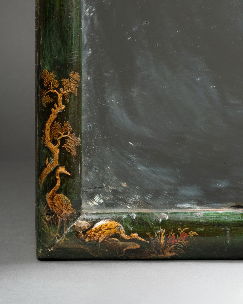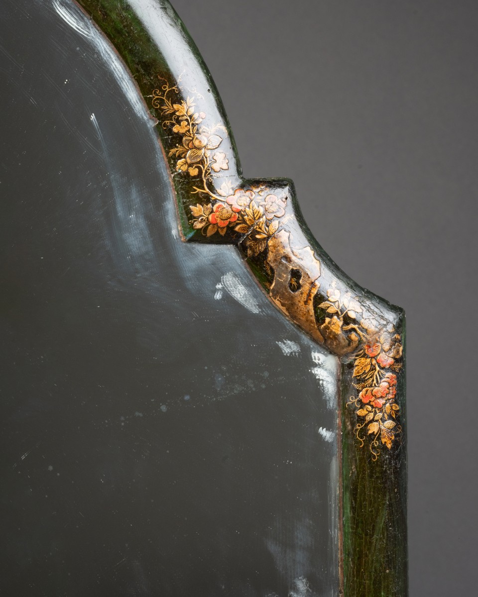 De forme rectangulaire avec une traverse haute chantournée et cintrée, il présente un très beau décor réalisé à la poudre d’or avec des rehauts de laque rouge sur un fond vert.