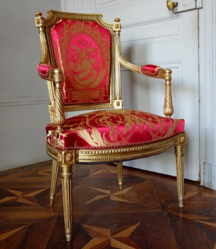 Mobilier de salon en bois sculpté et doré, riche modèle de la fin du style Louis XVI, le plus abouti et le plus raffiné celui qui était à la mode juste avant la révolution pour les derniers feux de l'ancien régime. Très riche décor sculpté, toutes les traverses sont sculptés de frise de feuilles d'acanthe et de rang de perles. Les dossiers sont en chapeau de gendarme à plumets, flanqués de colonnettes et avec de très élégantes liaisons "en bateau" aux accotoirs. Ces derniers reliés à la ceinture par un balustre cannelé en torsade. Il s'agit d'un très beau modèle probablement à l'origine l’œuvre d'un grand menuisier en sièges du 18e siècle tel que Séné ou Jacob qui a ensuite été copié. Les cinq sièges sont recouverts d'un très luxueux lampas de soie rouge et or à motif placés de style Louis XVI de la maison Tassinari et Chatel.