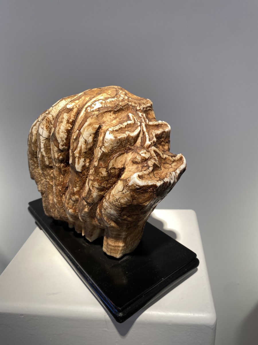 Molaire de mammouth exceptionnellement grande. Idéal pour votre cabinet de curiosités! Belle patine couleur crème de la dent fossile. Soclé sur bois. Dimensions: 24x19x9cm.