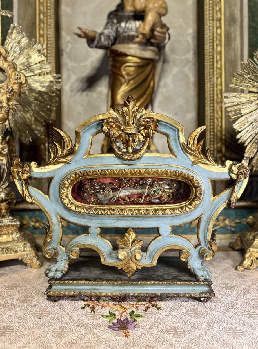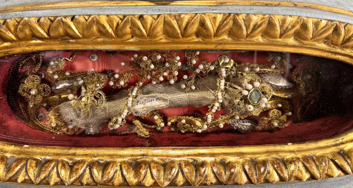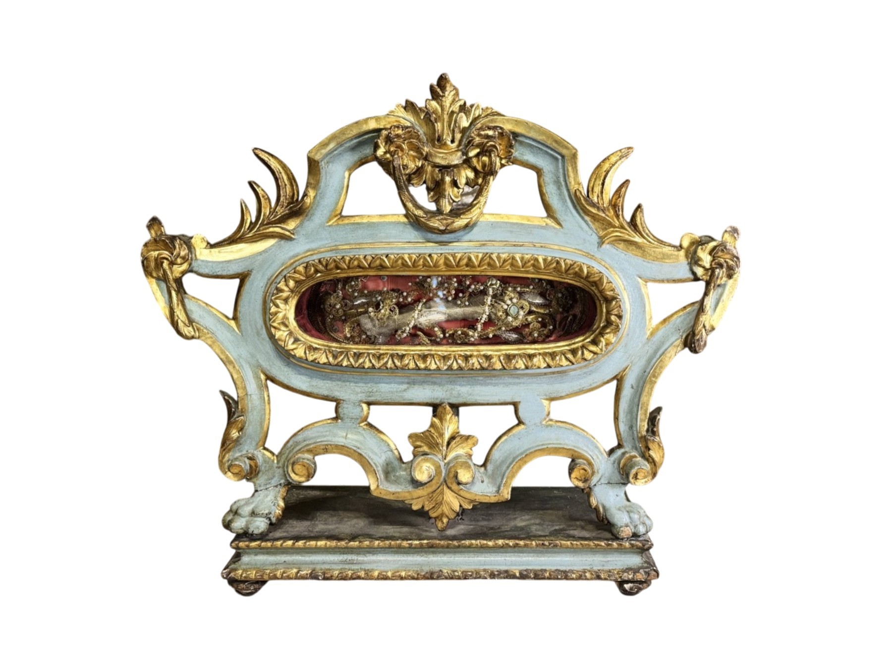 Relique notable de Saint Faustinus enchassée dans un spectaculaire reliquaire en bois finement sculpté, peint et doré à la feuille d’or.