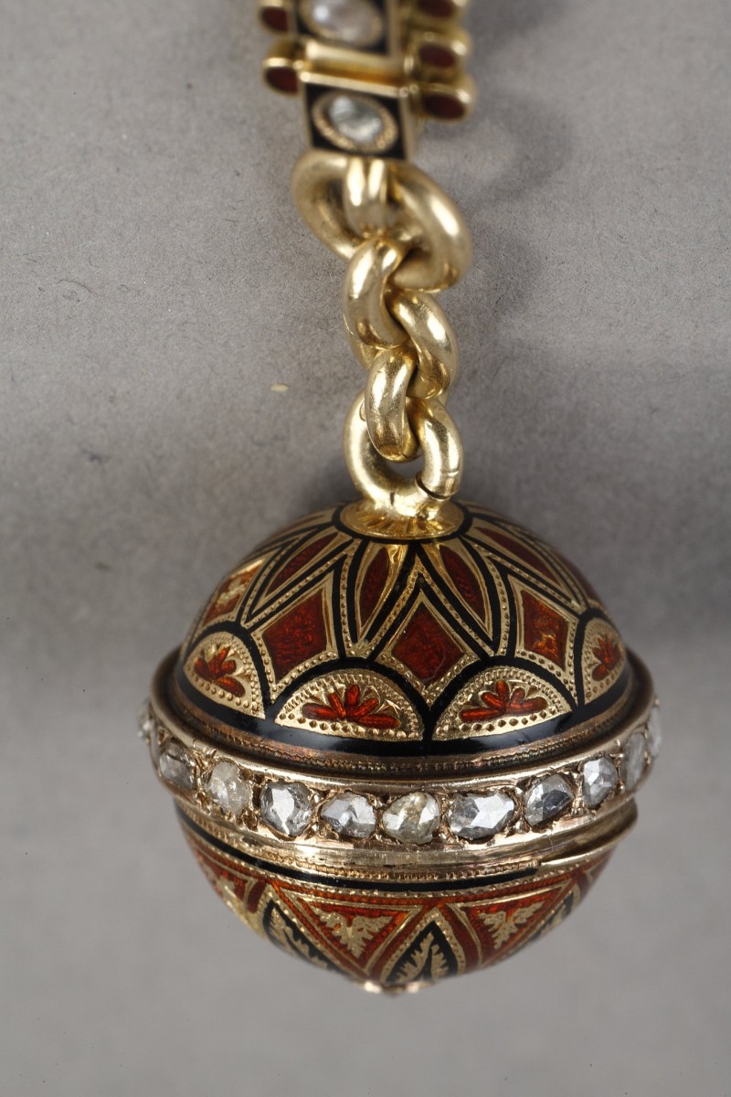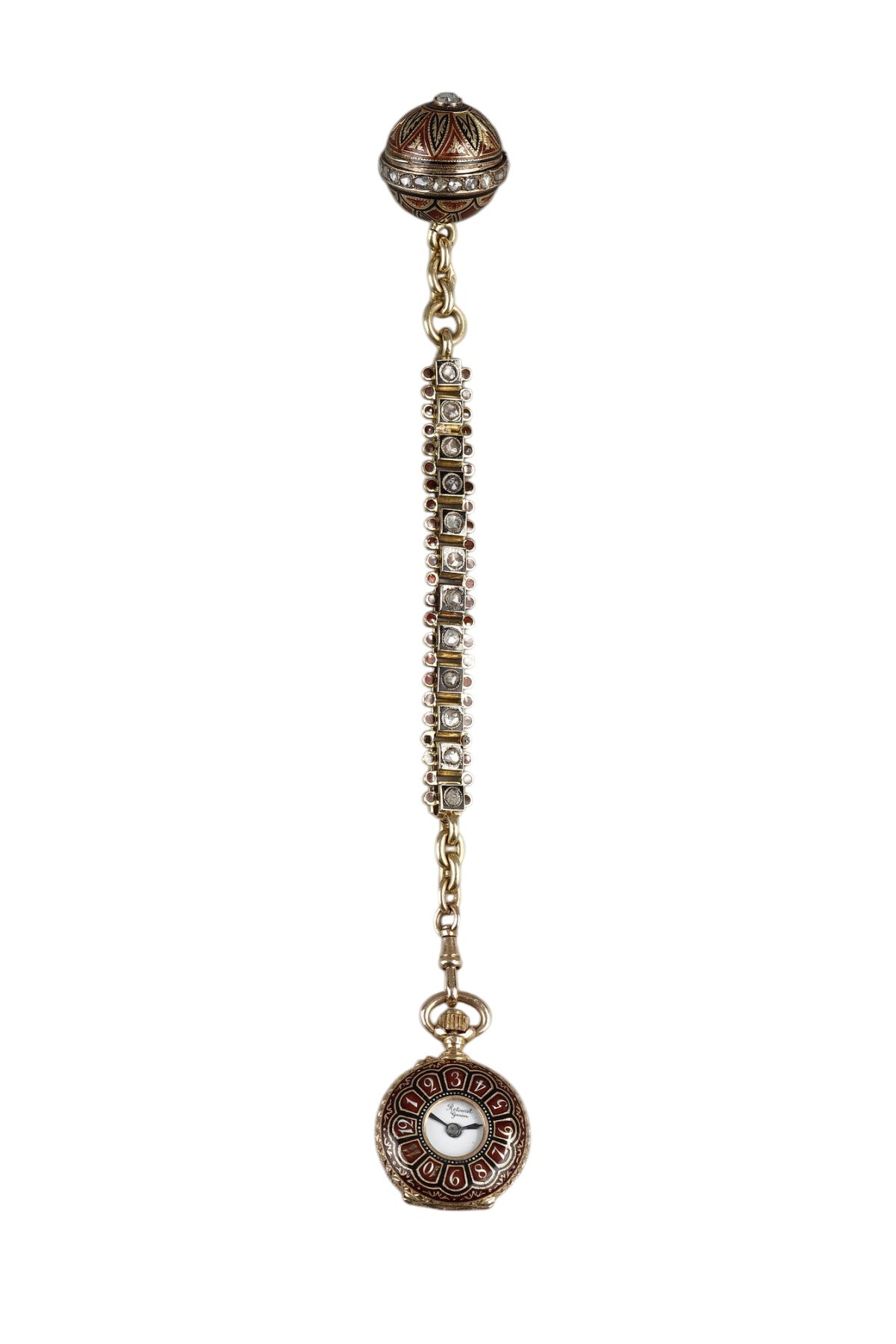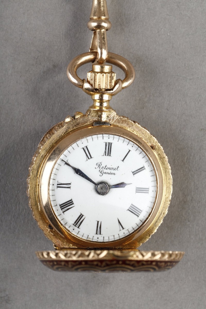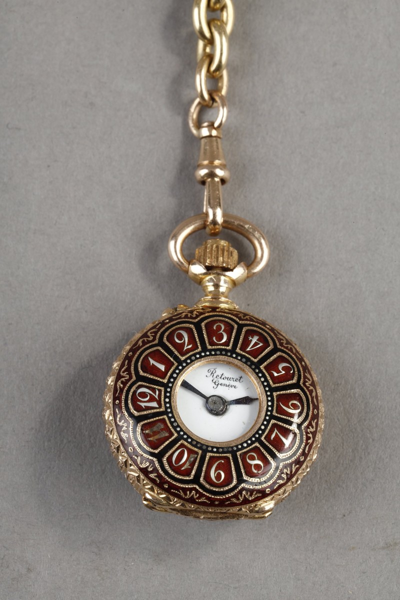 Montre de col savonette en or, diamants et émail. Son cadran émaillé blanc signé "Retouret Genève" comporte des chiffres romains. Son couvercle émaillé couleur chocolat et noir porte les chiffres arabes dans des cartouches. Le dos de la boîte est pavé de roses couronnées, dont une plus importante au centre, formant une rosace. Mouvement mécanique. Elle est accompagnée d'une châtelaine agrémentée d'un pendentif ouvrant composé d'une boule ponctuée de roses couronnées. Travail de la seconde moitié du XIXe siècle, Suisse. En l'etat.