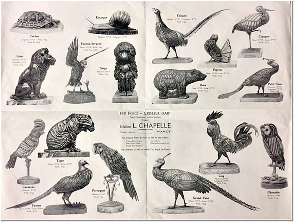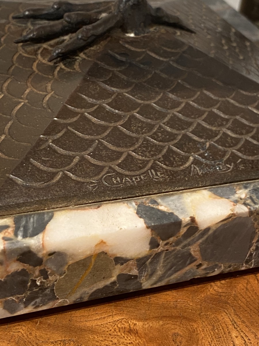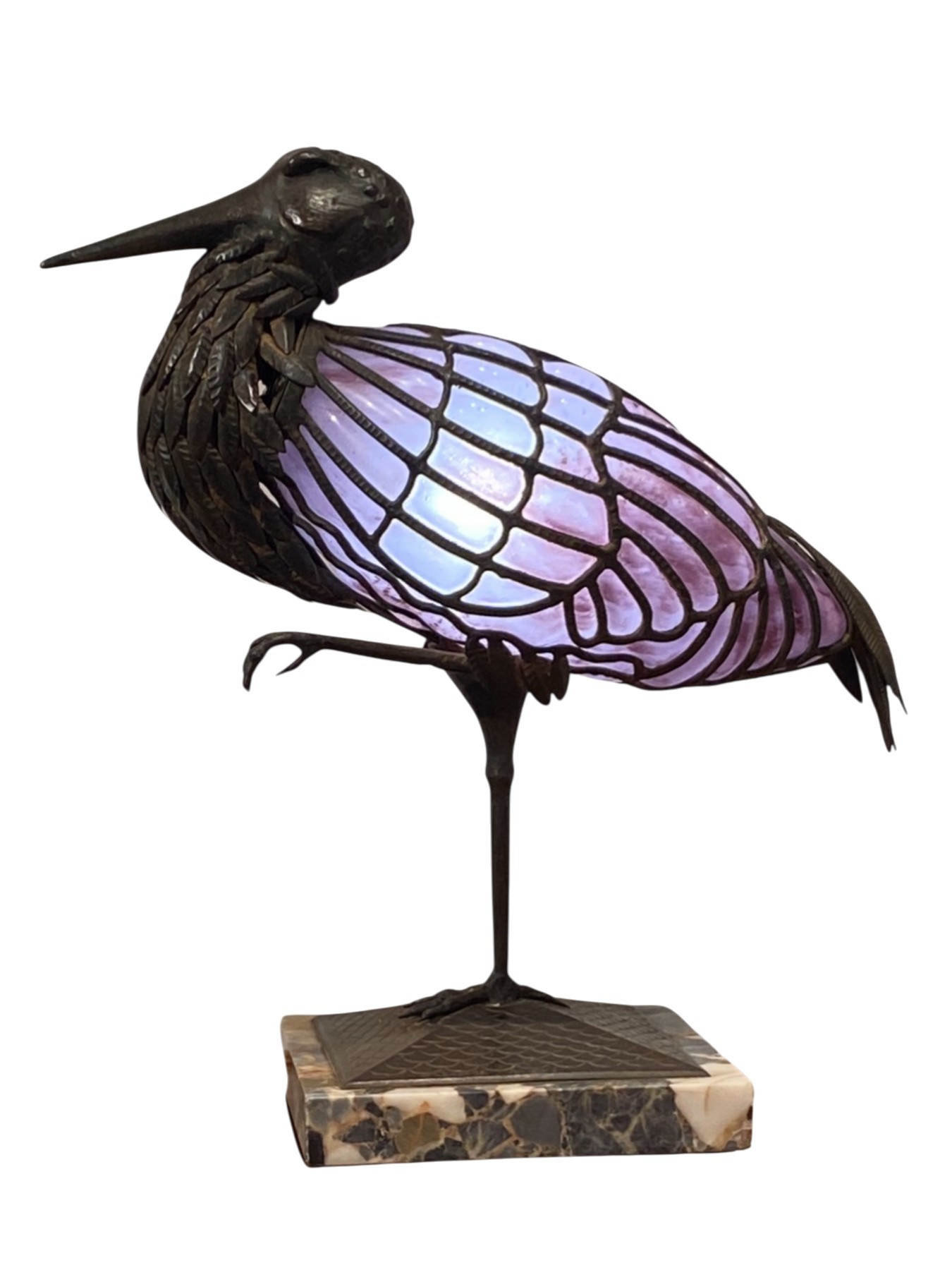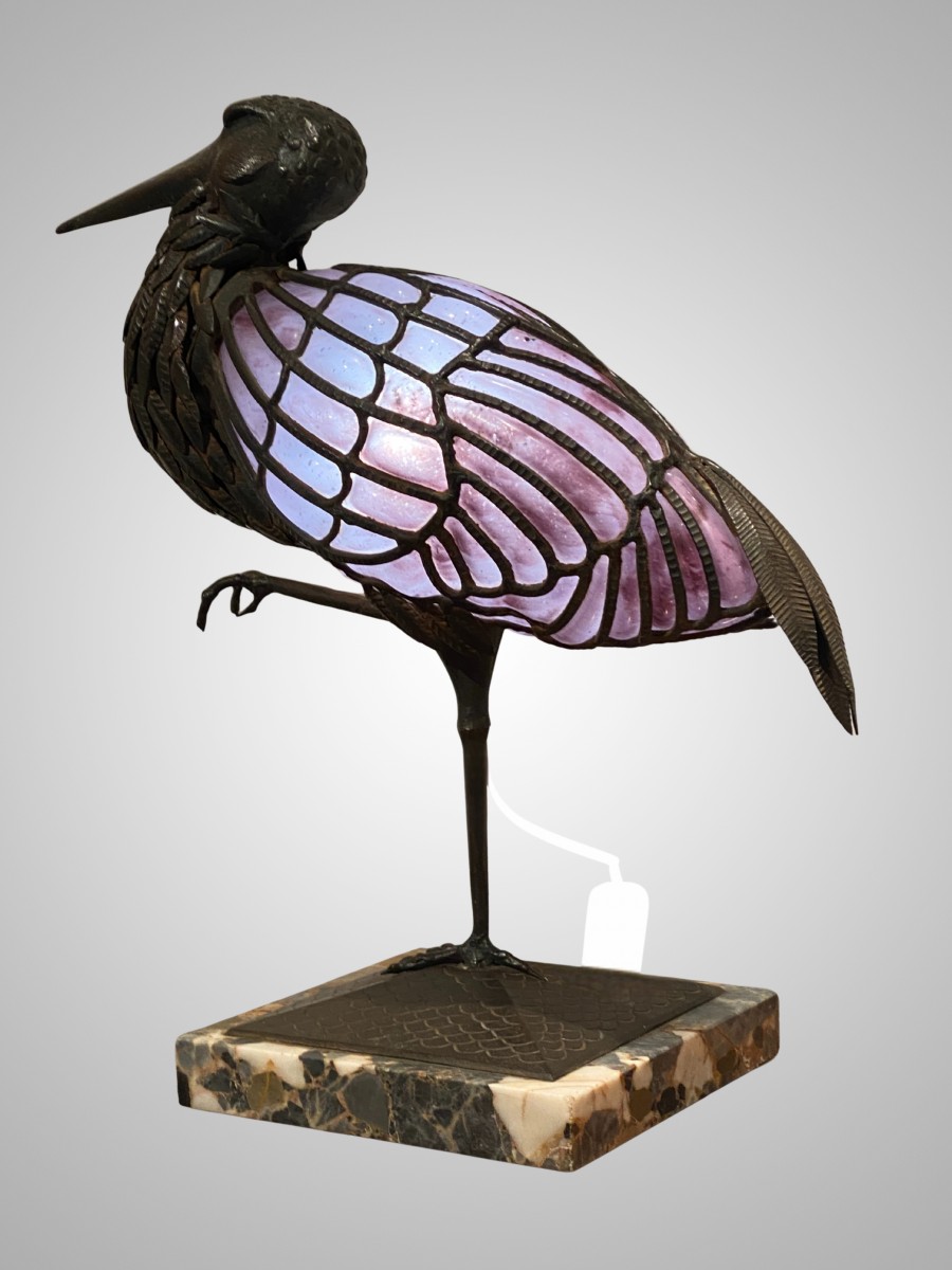 Lampe sculpture “Cigogne”, réalisée entre 1929 et 1935 par les frères Muller à Lunéville et le ferronnier d’art Chapelle à Nancy. L’oiseau, en fer forgé martelé, accueille un corps en verre polychrome soufflé dans une résille métallique — procédé breveté par Muller en 1929. La pièce, signée “Chapelle Nancy” sur la base, repose sur un élégant socle en marbre veiné.