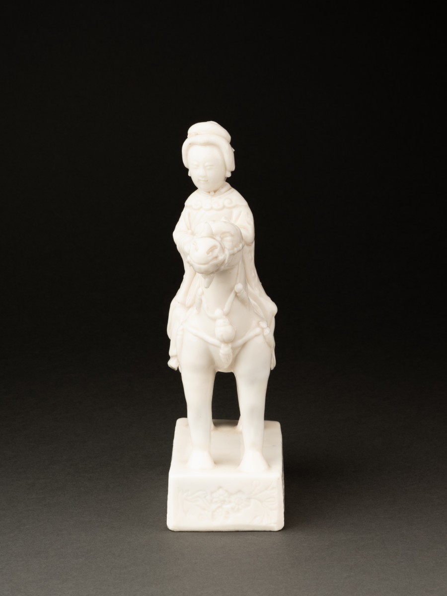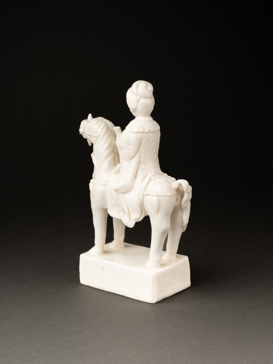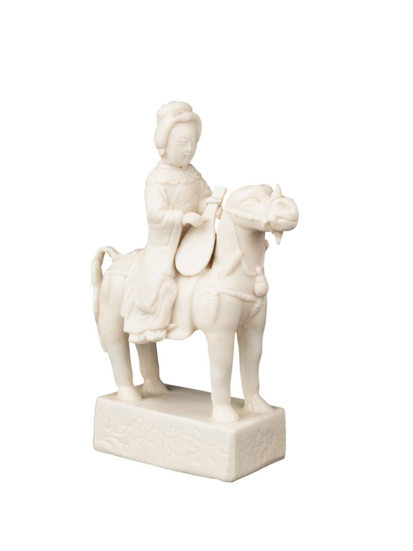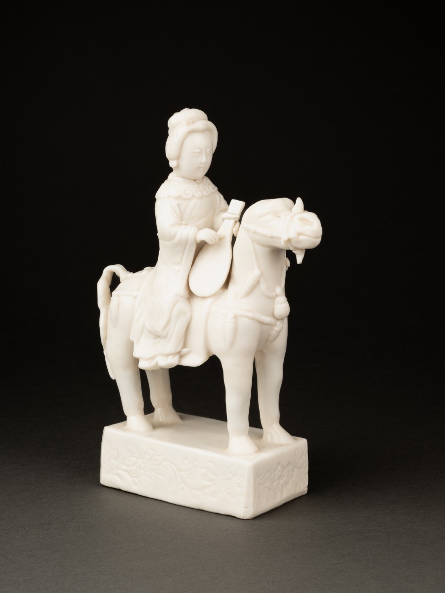 Belle figurine en porcelaine "blanc de Chine" représentant une musicienne à cheval entrain de jouer du Pipa (luth chinois).