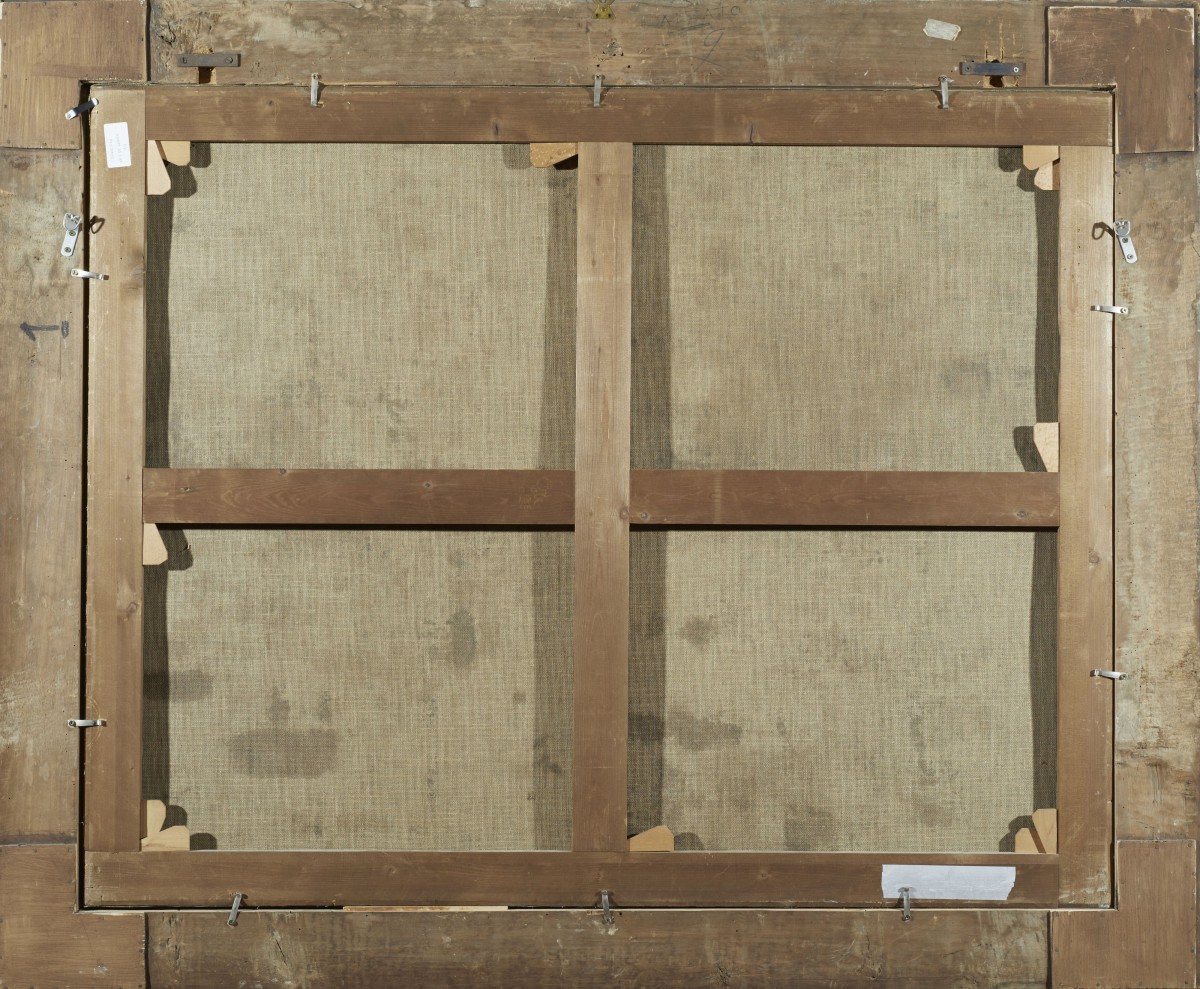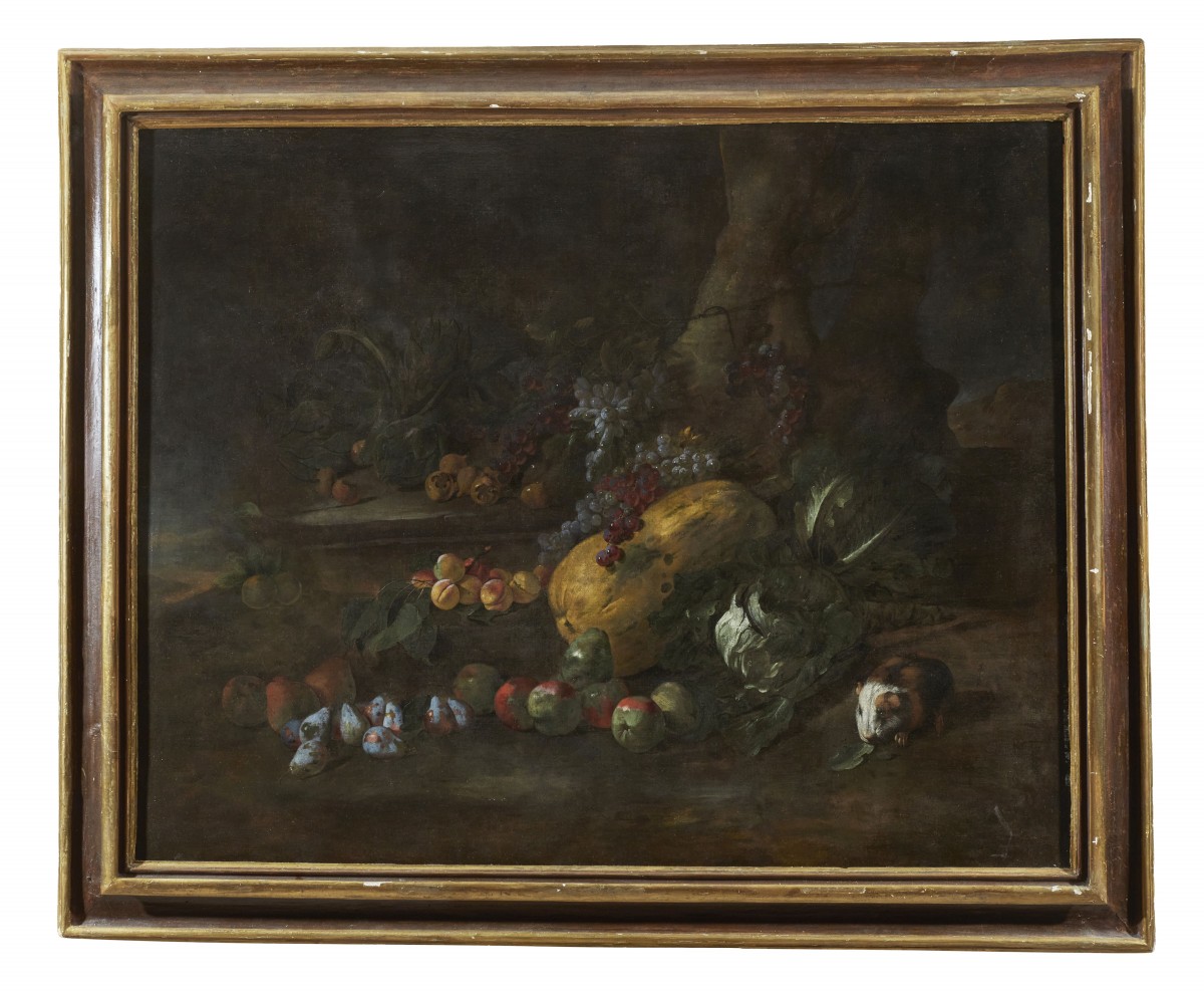 Peinture à l'huile sur toile de 118 x 148,5 cm sans cadre et de 133 x 163 cm avec un magnifique cadre d'époque représentant des fruits et des légumes en plein air avec un cochon d'Inde, réalisée par le peintre Angelo Maria Rossi (actif à Milan dans la seconde moitié du XVIIe siècle).