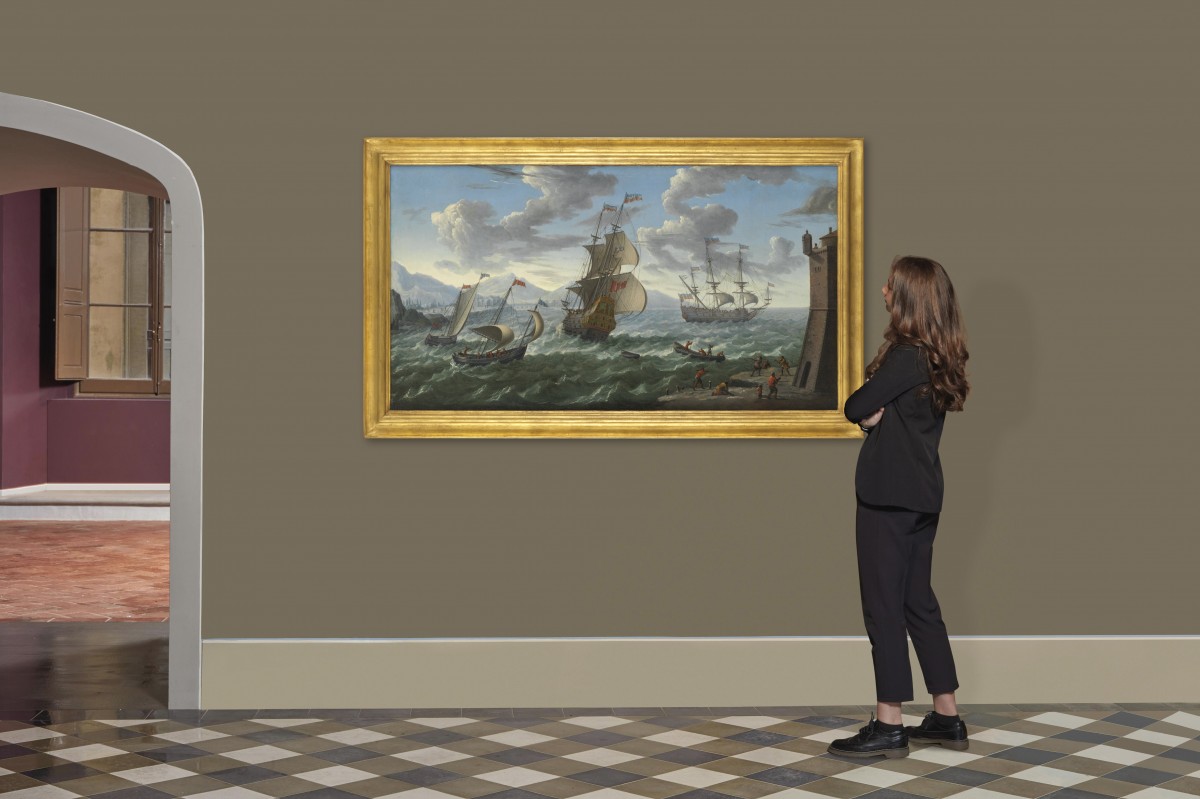 ... que le traitement vivant du ciel et de la mer font typiquement écho au répertoire d’Abraham Storck. On y retrouve son goût du sublime, du mouvement et de la lumière contrastée, combinant précision technique des bâtiments et intérêt pour les effets atmosphériques. Le rendu minutieux des gréements (les moindres cordages sont tracés), des ponts ou de la décorations de la poupe du navire central (où l’on distingue une représentation de Poséidon), relève d’un véritable souci documentaire propre à Storck, influencé par les Van de Veldes. Pourtant, ses figures sont brossées avec économie de moyens, ceci afin de renforcer le récit maritime plutôt que l’anecdote individuelle.