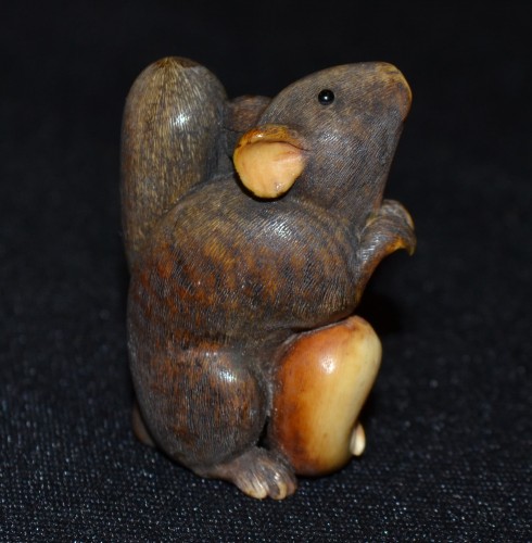Signe de qualité, ce netsuké sculpté dans une dent de sanglier n'a pas de trous d'attache pour passer le cordon, l'imotoshi (l'attache) est ici naturellement formé par la base de la queue.Les yeux saillants sont incrustés,ils sont taillés dans une matière noire, certainement de la corne. La sculpture, les proportions, le réalisme, les détails, tout est parfait. Le loir parait vivant. Il est surpris lors de son repas, l'animal se redresse, inquiet et scrute les alentours. Son repas grignoté, une courge ou une aubergine, reste serrée entre ses pattes. Il n'y a pas de signature mais il s'agit là de l'oeuvre d'un excellent artiste du début du 19° siècle. On peut distinguer à la loupe une série de minuscules tenons qui comblent des fentes, il ne s'agit pas de restaurations tardives car le pelage est parfaitement dessiné dessus . La dent a dû se rétracter et se fendre légèrement en séchant ,durant la sculpture. L'artiste a simplement comblé ces fentes.